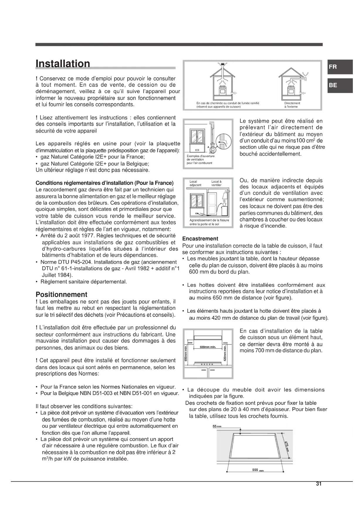 - gaz Naturel Catégorie I2E+ pour la Belgique; Un ultérieur réglage n’est donc pas nécessaire. Conditions réglementaires d’installation (Pour la France) Le raccordement gaz devra être fait par un technicien qui assurera la bonne alimentation en gaz et le meilleur réglage de la combustion des brûleurs. Ces opérations d’installation, quoique simples, sont délicates et primordiales pour que votre table de cuisson vous rende le meilleur service. L’installation doit être effectuée conformément aux textes réglementaires et règles de l’art en vigueur, notamment: