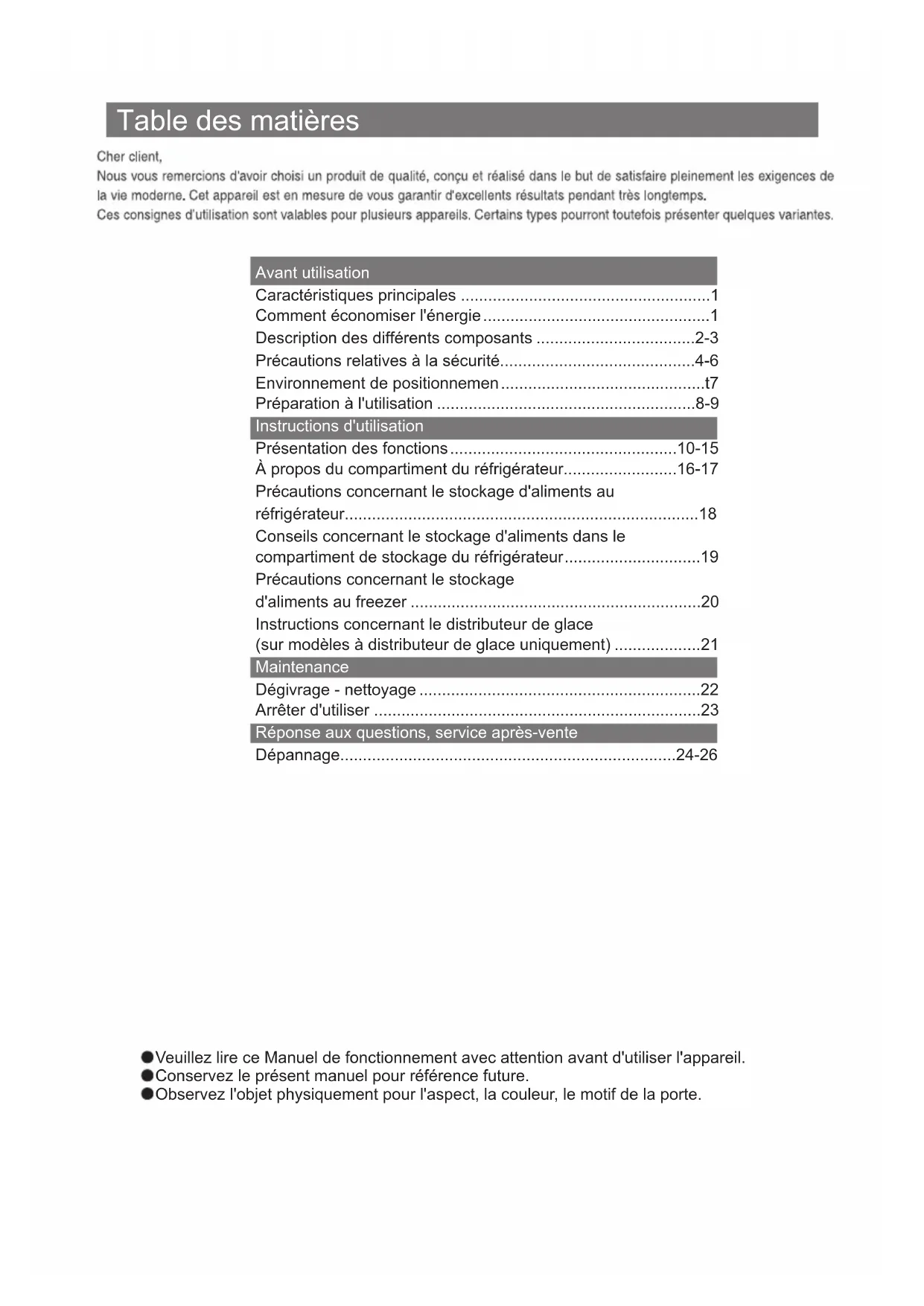 - réfrigérateur tourne souvent ou pendant de longues périodes La température intérieure ou extérieure est trop élevée. Le réfrigérateur a été éteint pendant un certain temps. Le distributeur de glace automatique est en marche. La porte est ouverte trop souvent ou pendant de longues périodes. La porte du compartiment de stockage du frigo / freezer n'est pas bien fermée. Le réglage de température pour le compartiment de stockage du freezer est trop bas. Le joint de porte du compartiment de stockage du frigo / freezer est sale, usé, craquelé ou mal monté. Le condensateur est encrassé. Dans ce cas, il est normal que le réfrigérateur tourne plus longtemps. Normalement, il faut 8 à 12 heures pour que le réfrigérateur se refroidisse complètement. Le processus de fabrication de glace fait tourner le réfrigérateur plus longtemps. De l'air chaud entre dans le réfrigérateur et le fait démarrer souvent. Veuillez ne pas ouvrir la porte trop souvent. Assurez-vous que le réfrigérateur est placé sur un sol de niveau et qu'il n'y a aucun aliment ou récipient qui bloque la porte. Voir “Ouverture/fermeture porte/tiroir” dans la section “Problèmes” Réglez la température plus haut jusqu'à obtenir une température de réfrigérateur satisfaisante. Il faut 24 heures pour que la température du réfrigérateur se stabilise. Nettoyez ou remplacez le joint de porte. Un jeu de fuite au niveau du joint de porte peut causer un fonctionnement plus long du réfrigérateur pour maintenir la température souhaitée. Nettoyez le condensateur. Température trop élevée Température trop élevée dans le compartiment de stockage du frigo/freezer La température dans le freezer est trop élevée alors que celle dans le compartiment de stockage du frigo est OK La porte est ouverte trop souvent ou trop longtemps à chaque fois. La température réglée est trop élevée. La porte n'est pas bien fermée. Le condensateur est encrassé. La température de freezer réglée est trop élevée. De l'air chaud entre dans le réfrigérateur à chaque fois que la porte est ouverte. Essayez d'ouvrir la porte le moins souvent possible. Réinitialisez la température. Voir “Ouverture/fermeture porte/tiroir” dans la section “Problèmes” Nettoyez le condensateur. Réglez une température du freezer plus basse. Il faut 24 heures pour que la température du réfrigérateur se stabilise. 24Dépannage Problèmes Causes Solutions Température trop élevée La température dans le compartiment de stockage du frigo est trop élevée alors que celle dans le freezer est OK La température de frigo réglée est trop élevée. Réglez une température du frigo plus basse. Il faut 24 heures pour que la température du réfrigérateur se stabilise. Eau/humidité/givre dans le réfrigérateur Climat chaud et humide. La porte n'est pas bien fermée. La porte est ouverte trop souvent ou trop longtemps à chaque fois. L'accumulation de givre et d'humidité s'accélère sous un tel climat. Voir “Ouverture/fermeture porte/tiroir” dans la section “Problèmes” Veuillez ne pas ouvrir la porte trop souvent. Eau/humidité/givre sur la surface externe du réfrigérateur Climat humide. La porte du réfrigérateur n'est pas bien fermée. Ceci cause la condensation de l'air froid dans le réfrigérateur et de l'air chaud tout autour. Ceci est normal sous un climat humide. L'humidité décroit avec l'hygrométrie. Voir “Ouverture/fermeture porte/tiroir” dans la section “Problèmes” Distributeur de glace automatique L'humidité s'accumule sur les parois internes du réfrigérateur L'humidité s'accumule sur la surface externe du réfrigérateur ou entre deux portes Le distributeur de glace ne fait pas de glace lLe distributeur de glace n'est pas allumé. La vanne d'arrivée d'eau n'est pas ouverte. La température dans le freezer n'est pas assez basse. Le distributeur de glace n'est pas installé en place. Allumez le distributeur de glace sur le panneau d'affichage. Ouvrez la vanne d'arrivée d'eau. Voir “Température trop élevée” dans la section “Problèmes” Enfoncez le distributeur de glace pour qu'il se mette en place. Le distributeur de glace n'arrête pas de faire de la glace La barre de detection de la glace est enfoncée en position basse par un objet dans le compartiment de stockage du freezer. Les glaçons ont mauvais goût Ils subissent les odeurs dans le compartiment de stockage du frigo ou du freezer L'eau fournie au distributeur de glace n'est pas douce. Les glaçons ont été stockés pendant trop longtemps. Fermez bien tous les aliments. Jetez les glaçons stockés pendant longtemps ou faits lors des premières charges. Ajoutez un filtre sur le tuyau d'arrivée d'eau. Veuillez consulter une société d'épuration d'eau. Jetez les glaçons stockés pendant trop longtemps. La capacité de glace est insuffisante La capacité de glace est inférieure à ce qui était prévu La température dans le freezer n'est pas assez basse. Le distributeur de glace fait environ 1kg de glaçons en 24 heures. Réglez une température du freezer plus basse. Enlevez l'objet qui gène la barre de détection de glace, libérez la barre de détection de glace et retirez tout la glace figée autour de la barre de détection de glaces. 25Dépannage Problèmes Causes Solutions Si vous entendez Des bips lLa porte du compartiment de stockage du frigo est ouverte. La température dans le freezer est trop élevée. Fermez la porte ou éteignez l'alarme manuellement. L'alarme est normale si elle a été initiée en raison d'une température relativement élevée. Vous pouvez éteindre l'alarme manuellement. Son anormal Le réfrigérateur n'est pas situé sur une surface de niveau. Le réfrigérateur touché un objet alentours. Réglez les pieds pour mettre le réfrigérateur de niveau. Enlevez les objets alentours. Léger son similaire à de l'eau qui coule Il s'agit du bruit du système de réfrigératio