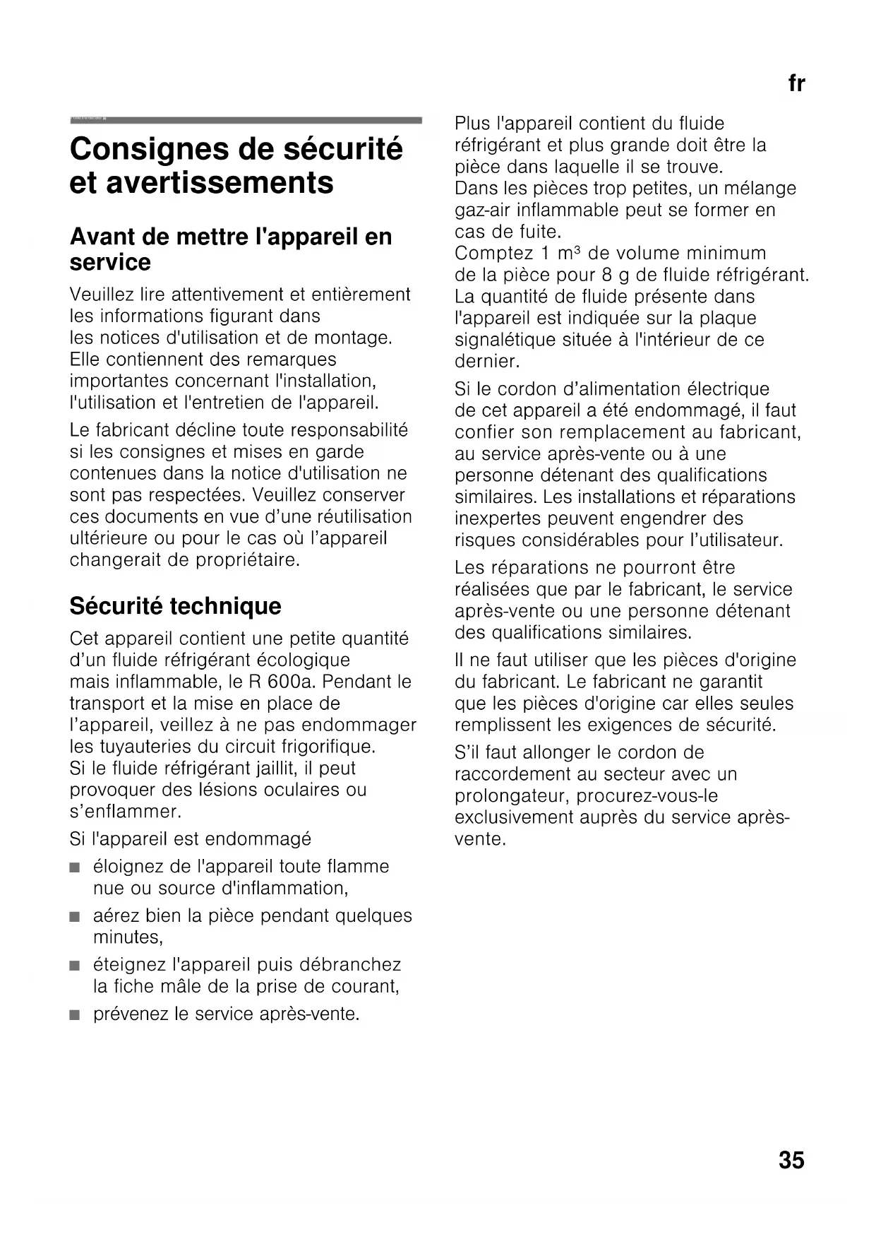 fr Table d es mat ières frMode d’emploi Consignes de sécurité et avertissements Avant de mettre l'appareil en service Veuillez lire attentivement et entièrement les informations figurant dans les notices d'utilisation et de montage. Elle contiennent des remarques importantes concernant l'installation, l'utilisation et l'entretien de l'appareil. Le fabricant décline toute responsabilité si les consignes et mises en garde contenues dans la notice d'utilisation ne sont pas respectées. Veuillez conserver ces documents en vue d’une réutilisation ultérieure ou pour le cas où l’appareil changerait de propriétaire. Sécurité technique Cet appareil contient une petite quantité d’un fluide réfrigérant écologique mais inflammable, le R 600a. Pendant le transport et la mise en place de l’appareil, veillez à ne pas endommager les tuyauteries du circuit frigorifique. Si le fluide réfrigérant jaillit, il peut provoquer des lésions oculaires ou s’enflammer. Si l'appareil est endommagé ■ éloignez de l'appareil toute flamme nue ou source d'inflammation, ■ aérez bien la pièce pendant quelques minutes, ■ éteignez l'appareil puis débranchez la fiche mâle de la prise de courant, ■ prévenez le service après-vente. Plus l'appareil contient du fluide réfrigérant et plus grande doit être la pièce dans laquelle il se trouve. Dans les pièces trop petites, un mélange gaz-air inflammable peut se former en cas de fuite. Comptez 1 m³ de volume minimum de la pièce pour 8 g de fluide réfrigérant. La quantité de fluide présente dans l'appareil est indiquée sur la plaque signalétique située à l'intérieur de ce dernier. Si le cordon d’alimentation électrique de cet appareil a été endommagé, il faut confier son remplacement au fabricant, au service après-vente ou à une personne détenant des qualifications similaires. Les installations et réparations inexpertes peuvent engendrer des risques considérables pour l’utilisateur. Les réparations ne pourront être réalisées que par le fabricant, le service après-vente ou une personne détenant des qualifications similaires. Il ne faut utiliser que les pièces d'origine du fabricant. Le fabricant ne garantit que les pièces d'origine car elles seules remplissent les exigences de sécurité. S’il faut allonger le cordon de raccordement au secteur avec un prolongateur, procurez-vous-le exclusivement auprès du service après- vente.fr