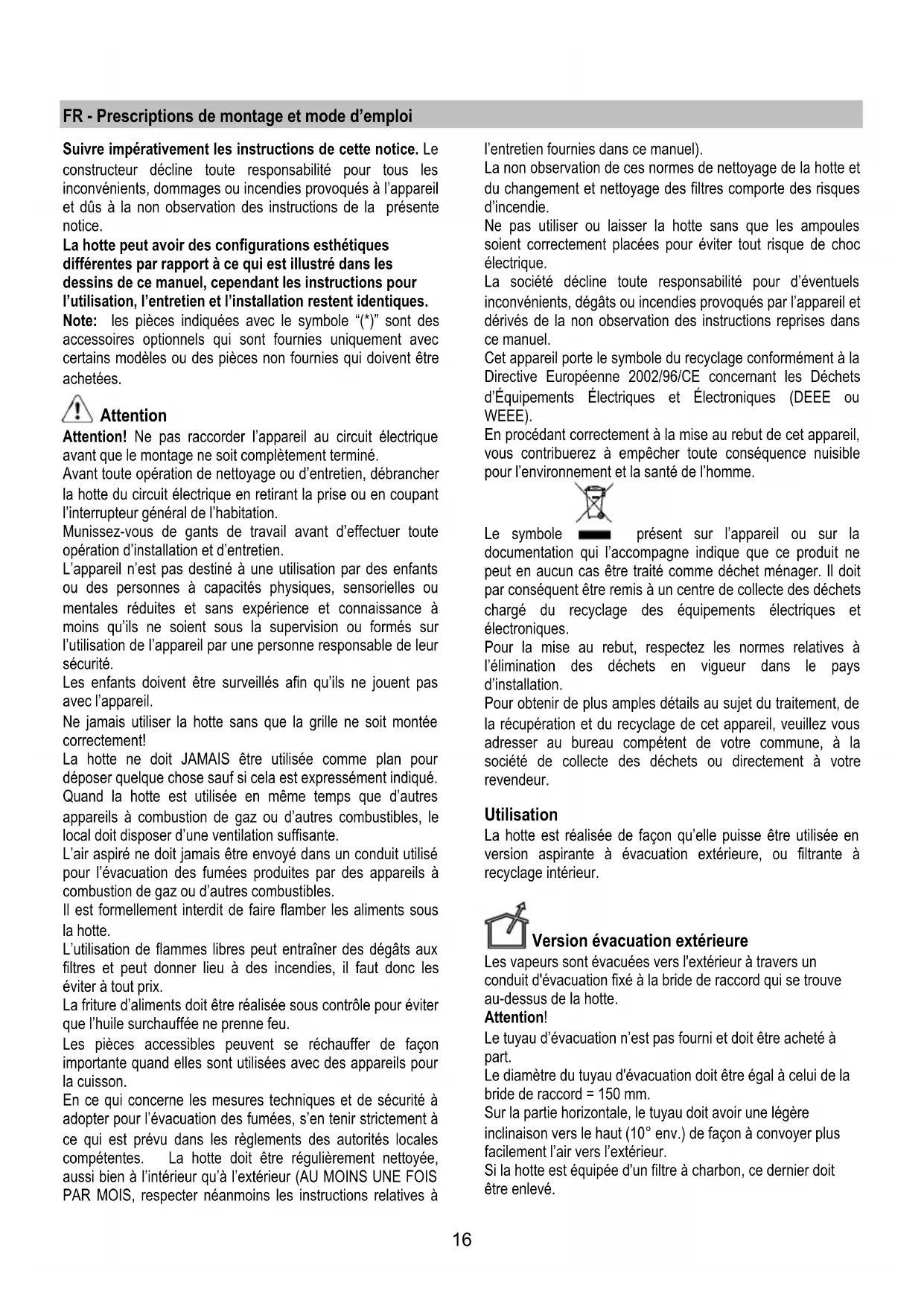 Ne jamais utiliser la hotte sans que la grille ne soit montée