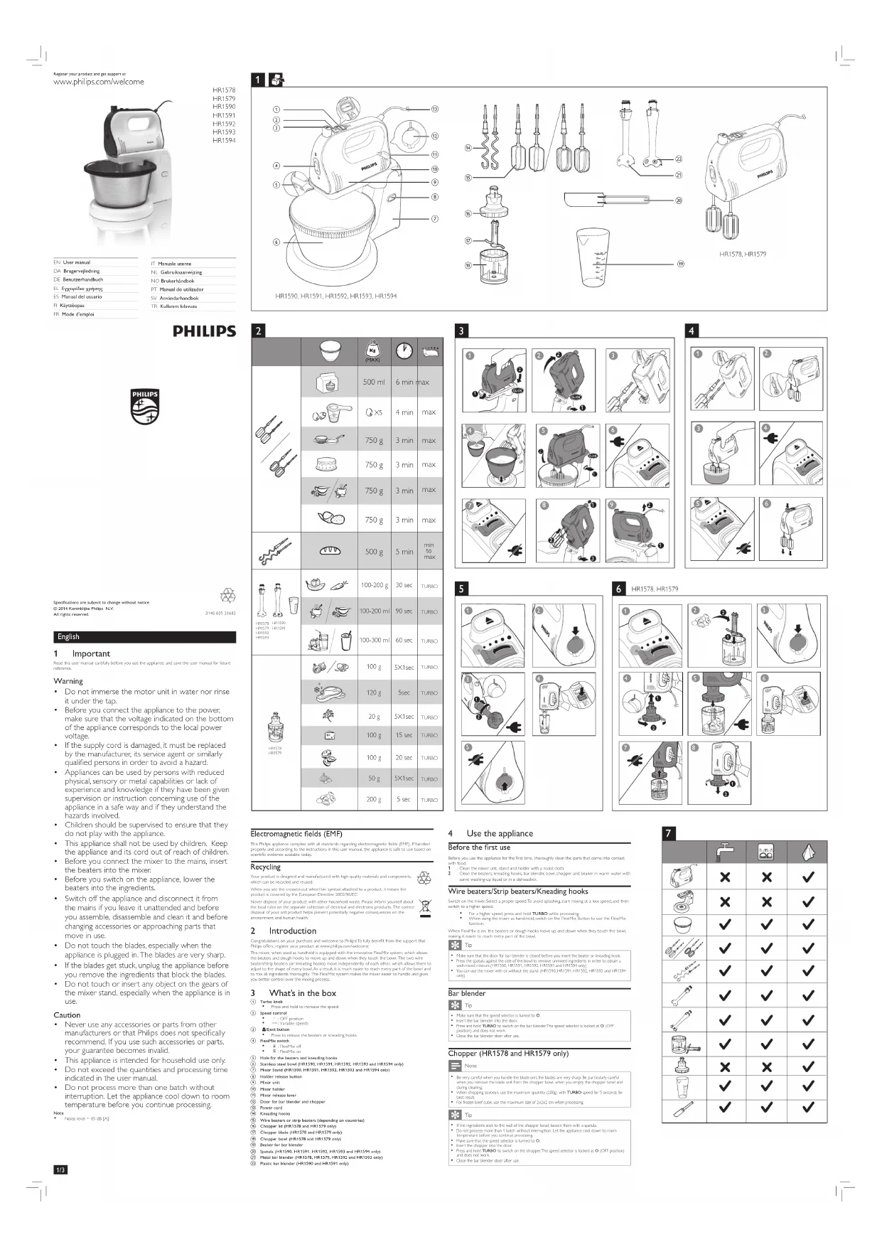 Avantdenettoyerl'appareilouderetirerunaccessoire,débranchez-le.1 Nettoyezl’unitédubatteuretlessupportsavecunchiffonhumide. 2 Nettoyezlesfouets,lescrochetsàpétrir,lemixeurplongeant,lehachoiretlebolàl’eau chaude savonneuse ou au lave-vaisselle. 6 Rangement 1 Enroulezlecordonautourdusocledel’appareil.2 Placezlaspatule,lesfouets,lescrochetsàpétriretlemixeurplongeantdanslebol. 3 Rangezl’unitédubatteur,lesupportdubatteur,lebolenacierinoxydableetlehachoirdans unendroitsecàl’abridelalumièredirectedusoleiloud’autressourcesdechaleur. 7 Commande d’accessoires Pouracheterdesaccessoirespourcetappareil,rendez-vouschezvotrerevendeurPhilipsoudansunCentreServiceAgrééPhilips.Sivousrencontrezdesproblèmespourvousprocurerdesaccessoirespourvotreappareil,contactezleServiceConsommateursPhilipsdevotrepays.Sescoordonnéessontdisponiblesàl’adressewww.philips.com/support.Vouspouvezcommanderlemini-hachoir(coden°314003900051)entantqu’accessoiresupplémentaire des appareils HR1578, HR1579, HR1590, HR1591, HR1592, HR1593 et HR1594 auprèsdevotrerevendeurPhilipsoud’unCentreServiceAgrééPhilips.Suivezlesquantités,lestempsdepréparationetlesvitessesdumini-hachoirlorsquevousutilisezcetaccessoire. 8 Garantie et service Sivousrencontrezunproblèmeousouhaitezobtenirdesinformationssupplémentaires,visitezlesiteWebPhilipsàl’adressewww.philips.com/supportoucontactezleServiceConsommateursPhilipsdevotrepays.Voustrouverezlenumérodetéléphonedansledépliantdegarantieinternationale.S’iln’existepasdeServiceConsommateursPhilipsdansvotrepays,renseignez-vousauprèsdevotrerevendeurPhilips. Italiano 1 Importante Leggereattentamenteilpresentemanualeprimadiutilizzarel’apparecchioeconservarloperriferimenti futuri. Avviso