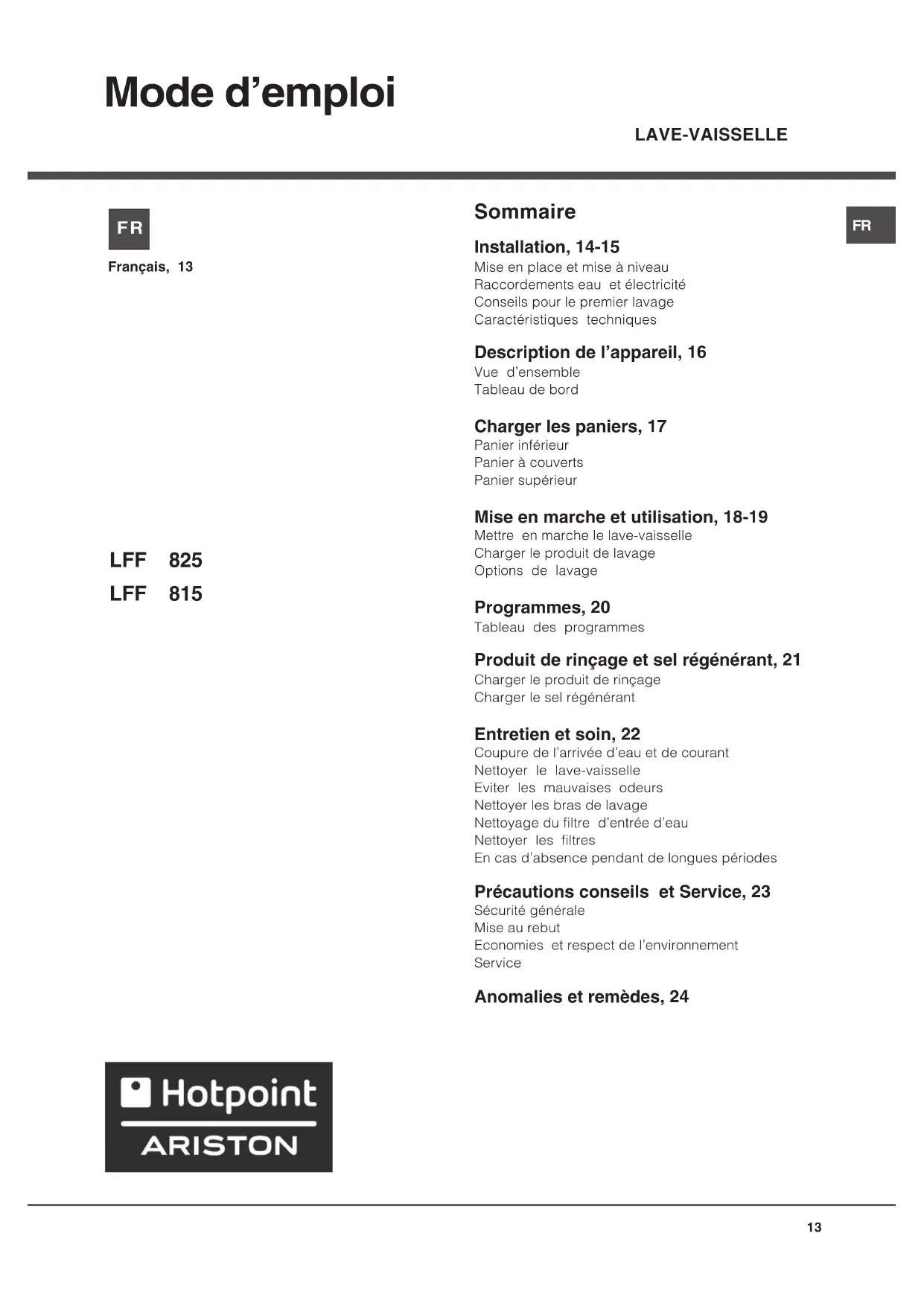 LFF 815 EUHA.R - Lave-vaisselle HOTPOINT ARISTON - Notice d'utilisation et mode d'emploi gratuit