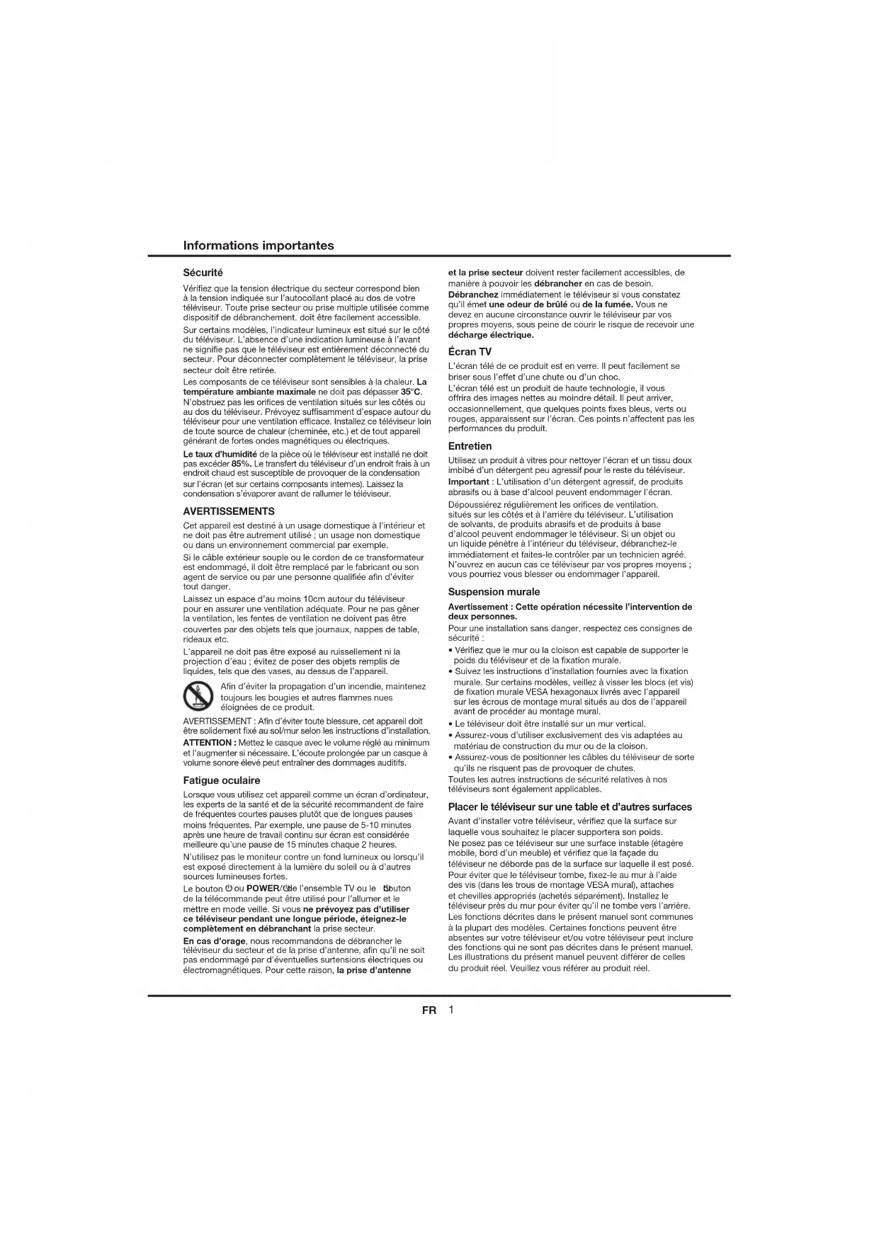 Informations importantes Sécurité Vérifiez que la tension électrique du secteur correspond bien à la tension indiquée sur l’autocollant placé au dos de votre téléviseur. Toute prise secteur ou prise multiple utilisée comme dispositif de débranchement. doit être facilement accessible. Sur certains modèles, l’indicateur lumineux est situé sur le côté du téléviseur. L’absence d’une indication lumineuse à l’avant ne signifie pas que le téléviseur est entièrement déconnecté du secteur. Pour déconnecter complètement le téléviseur, la prise secteur doit être retirée. Les composants de ce téléviseur sont sensibles à la chaleur. La température ambiante maximale ne doit pas dépasser 35°C. N’obstruez pas les orifices de ventilation situés sur les côtés ou au dos du téléviseur. Prévoyez suffisamment d’espace autour du téléviseur pour une ventilation efficace. Installez ce téléviseur loin de toute source de chaleur (cheminée, etc.) et de tout appareil générant de fortes ondes magnétiques ou électriques. Le taux d’humidité de la pièce où le téléviseur est installé ne doit pas excéder 85%. Le transfert du téléviseur d’un endroit frais à un endroit chaud est susceptible de provoquer de la condensation sur l’écran (et sur certains composants internes). Laissez la condensation s’évaporer avant de rallumer le téléviseur. AVERTISSEMENTS Cet appareil est destiné à un usage domestique à l’intérieur et ne doit pas être autrement utilisé ; un usage non domestique ou dans un environnement commercial par exemple. Si le câble extérieur souple ou le cordon de ce transformateur est endommagé, il doit être remplacé par le fabricant ou son agent de service ou par une personne qualifiée afin d’éviter tout danger. Laissez un espace d’au moins 10cm autour du téléviseur pour en assurer une ventilation adéquate. Pour ne pas gêner la ventilation, les fentes de ventilation ne doivent pas être couvertes par des objets tels que journaux, nappes de table, rideaux etc. L’appareil ne doit pas être exposé au ruissellement ni la projection d’eau ; évitez de poser des objets remplis de liquides, tels que des vases, au dessus de l’appareil. Afin d’éviter la propagation d’un incendie, maintenez toujours les bougies et autres flammes nues éloignées de ce produit.