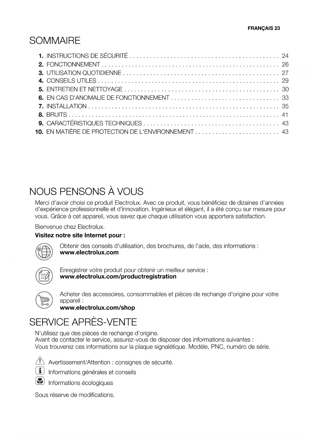 Merci d'avoir choisi ce produit Electrolux. Avec ce produit, vous bénéficiez de dizaines d'années d'expérience professionnelle et d'innovation. Ingénieux et élégant, il a été conçu sur mesure pour vous. Grâce à cet appareil, vous savez que chaque utilisation vous apportera satisfaction. Bienvenue chez Electrolux. Visitez notre site Internet pour : Obtenir des conseils d'utilisation, des brochures, de l'aide, des informations : www.electrolux.com Enregistrer votre produit pour obtenir un meilleur service : www.electrolux.com/productregistration Acheter des accessoires, consommables et pièces de rechange d'origine pour votre appareil : www.electrolux.com/shop