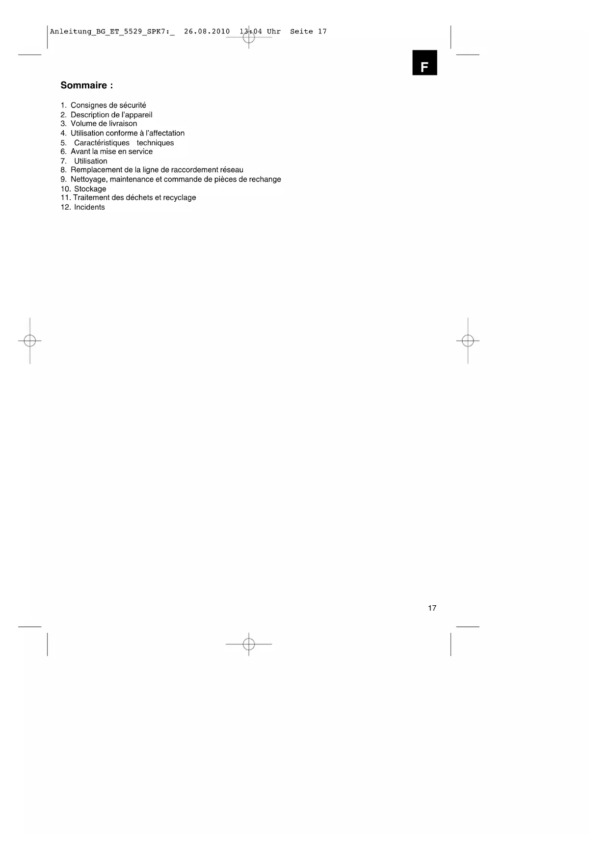 port à l’adresse indiquée ci-dessous. Ajoutez à l’envoi l’original du bon d’achat ou de tout autre preuve de l’achat datée. Veuillez donc toujours bien conserver le bon d’achat en guise de preuve ! Décrivez la raison de la réclamation le plus précisément possible. Si le défaut de l’appareil est compris dans notre prestation de garantie, nous vous retournerons sans délai un appareil réparé ou encore un nouveau. Bien entendu, nous sommes prêts également à réparer les appareils défectueux contre remboursement des frais, dès lors que l’appareil n’est plus ou pas garanti. Pour ce faire, veuillez envoyer l’appareil à notre adresse de service après-vente. Anleitung_BG_ET_5529_SPK7:_ 26.08.2010 13:04 Uhr Seite 9091