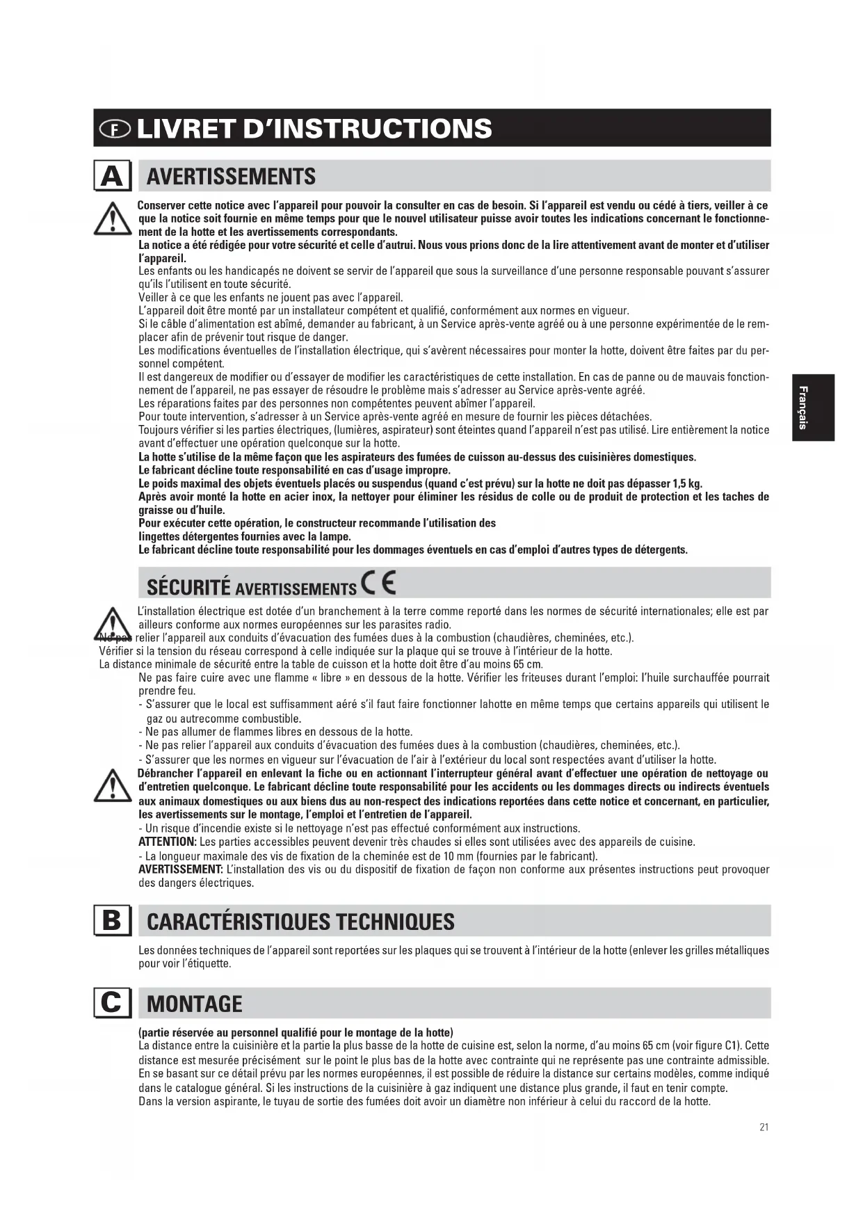 Conserver cette notice avec l’appareil pour pouvoir la consulter en cas de besoin. Si l’appareil est vendu ou cédé à tiers, veiller à ce que la notice soit fournie en même temps pour que le nouvel utilisateur puisse avoir toutes les indications concernant le fonctionne- ment de la hotte et les avertissements correspondants. La notice a été rédigée pour votre sécurité et celle d’autrui. Nous vous prions donc de la lire attentivement avant de monter et d’utiliser l’appareil. Les enfants ou les handicapés ne doivent se servir de l’appareil que sous la surveillance d’une personne responsable pouvant s’assurer qu’ils l’utilisent en toute sécurité.Veiller à ce que les enfants ne jouent pas avec l’appareil.L’appareil doit être monté par un installateur compétent et qualifié, conformément aux normes en vigueur. Si le câble d’alimentation est abîmé, demander au fabricant, à un Service après-vente agréé ou à une personne expérimentée de le rem- placer afin de prévenir tout risque de danger. Les modifications éventuelles de l’installation électrique, qui s’avèrent nécessaires pour monter la hotte, doivent être faites par du per- sonnel compétent. Il est dangereux de modifier ou d’essayer de modifier les caractéristiques de cette installation. En cas de panne ou de mauvais fonction- nement de l’appareil, ne pas essayer de résoudre le problème mais s’adresser au Service après-vente agréé.Les réparations faites par des personnes non compétentes peuvent abîmer l’appareil.Pour toute intervention, s’adresser à un Service après-vente agréé en mesure de fournir les pièces détachées. Toujours vérifier si les parties électriques, (lumières, aspirateur) sont éteintes quand l’appareil n’est pas utilisé. Lire entièrement la notice avant d’effectuer une opération quelconque sur la hotte.La hotte s’utilise de la même façon que les aspirateurs des fumées de cuisson au-dessus des cuisinières domestiques.Le fabricant décline toute responsabilité en cas d’usage impropre.Le poids maximal des objets éventuels placés ou suspendus (quand c’est prévu) sur la hotte ne doit pas dépasser 1,5 kg. Après avoir monté la hotte en acier inox, la nettoyer pour éliminer les résidus de colle ou de produit de protection et les taches de graisse ou d’huile.Pour exécuter cette opération, le constructeur recommande l’utilisation deslingettes détergentes fournies avec la lampe.Le fabricant décline toute responsabilité pour les dommages éventuels en cas d’emploi d’autres types de détergents.