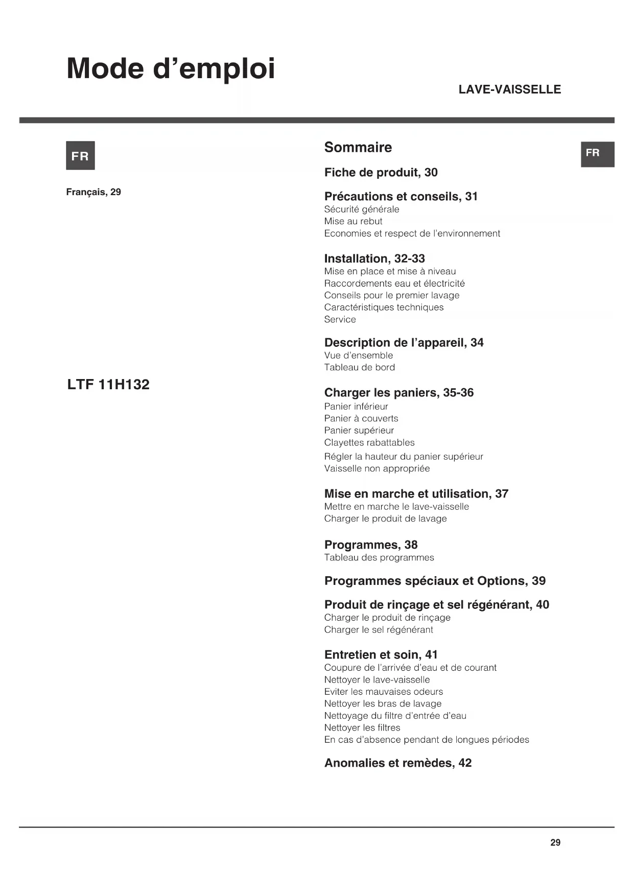 Mode d’emploi Sommaire Fiche de produit, 30 Précautions et conseils, 31 Sécurité générale Mise au rebut Economies et respect de l’environnement Installation, 32-33 Mise en place et mise à niveau Raccordements eau et électricité Conseils pour le premier lavage Caractéristiques techniques Service Description de l’appareil, 34 Vue d’ensemble Tableau de bord Charger les paniers, 35-36 Panier inférieur Panier à couverts Panier supérieur Clayettes rabattables Régler la hauteur du panier supérieur Vaisselle non appropriée Mise en marche et utilisation, 37 Mettre en marche le lave-vaisselle Charger le produit de lavage Programmes, 38 Tableau des programmes Programmes spéciaux et Options, 39 Produit de rinçage et sel régénérant, 40 Charger le produit de rinçage Charger le sel régénérant Entretien et soin, 41 Coupure de l’arrivée d’eau et de courant Nettoyer le lave-vaisselle Eviter les mauvaises odeurs Nettoyer les bras de lavage Nettoyage du filtre d’entrée d’eau Nettoyer les filtres En cas d’absence pendant de longues périodes Anomalies et remèdes, 42 LTF 11H132 LAVE-VAISSELLE Français, 29 FR30