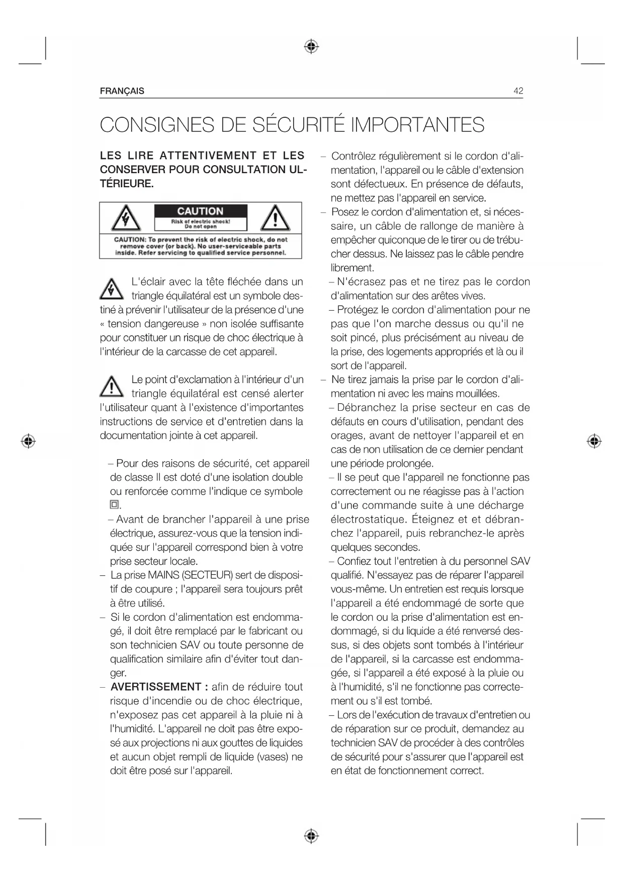 – Avant de brancher l'appareil à une prise électrique, assurez-vous que la tension indi- quée sur l'appareil correspond bien à votre prise secteur locale. – La prise MAINS (SECTEUR) sert de disposi- tif de coupure; l'appareil sera toujours prêt à être utilisé. – Si le cordon d'alimentation est endomma- gé, il doit être remplacé par le fabricant ou son technicien SAV ou toute personne de qualification similaire afin d'éviter tout dan- ger. – AVERTISSEMENT: afin de réduire tout risque d'incendie ou de choc électrique, n'exposez pas cet appareil à la pluie ni à l'humidité. L'appareil ne doit pas être expo- sé aux projections ni aux gouttes de liquides et aucun objet rempli de liquide (vases) ne doit être posé sur l'appareil.