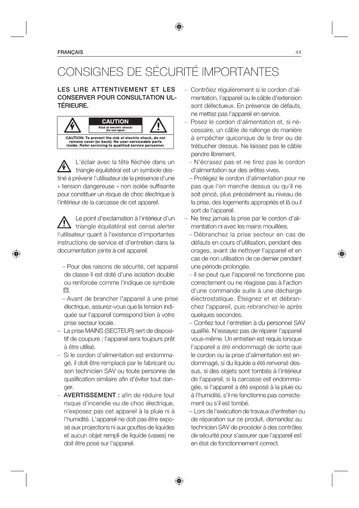 – Avant de brancher l'appareil à une prise électrique, assurez-vous que la tension indi- quée sur l'appareil correspond bien à votre prise secteur locale. – La prise MAINS (SECTEUR) sert de disposi- tif de coupure; l'appareil sera toujours prêt à être utilisé. – Si le cordon d'alimentation est endomma- gé, il doit être remplacé par le fabricant ou son technicien SAV ou toute personne de qualification similaire afin d'éviter tout dan- ger. – AVERTISSEMENT: afin de réduire tout risque d'incendie ou de choc électrique, n'exposez pas cet appareil à la pluie ni à l'humidité. L'appareil ne doit pas être expo- sé aux projections ni aux gouttes de liquides et aucun objet rempli de liquide (vases) ne doit être posé sur l'appareil.