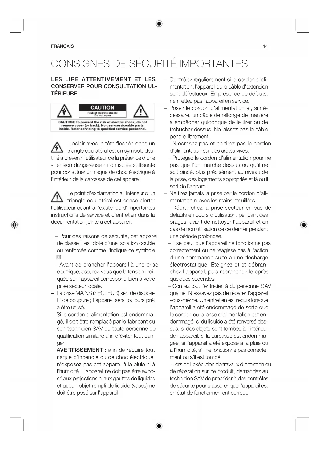 – Avant de brancher l'appareil à une prise électrique, assurez-vous que la tension indi- quée sur l'appareil correspond bien à votre prise secteur locale. – La prise MAINS (SECTEUR) sert de disposi- tif de coupure; l'appareil sera toujours prêt à être utilisé. – Si le cordon d'alimentation est endomma- gé, il doit être remplacé par le fabricant ou son technicien SAV ou toute personne de qualification similaire afin d'éviter tout dan- ger. – AVERTISSEMENT: afin de réduire tout risque d'incendie ou de choc électrique, n'exposez pas cet appareil à la pluie ni à l'humidité. L'appareil ne doit pas être expo- sé aux projections ni aux gouttes de liquides et aucun objet rempli de liquide (vases) ne doit être posé sur l'appareil.
