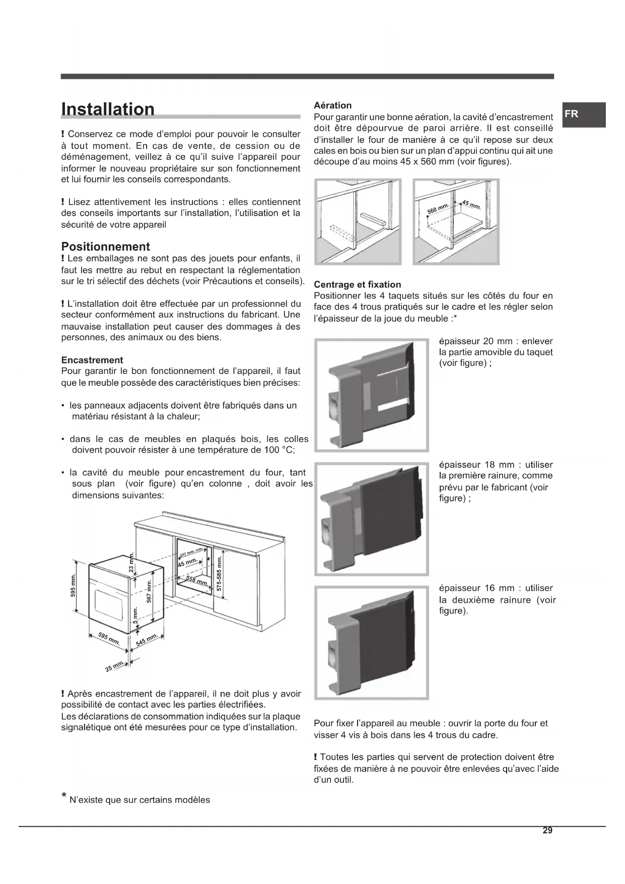 - la cavité du meuble pour encastrement du four, tant sous plan (voir gure) qu’en colonne , doit avoir les dimensions suivantes: 595 mm. 595 mm.25 mm.545 mm.5 mm.567 mm.23 mm.575-585 mm.45 mm.558 mm. 547 mm. min. ! Après encastrement de l’appareil, il ne doit plus y avoir possibilité de contact avec les parties électriées. Les déclarations de consommation indiquées sur la plaque signalétique ont été mesurées pour ce type d’installation. Aération Pour garantir une bonne aération, la cavité d’encastrement doit être dépourvue de paroi arrière. Il est conseillé d’installer le four de manière à ce qu’il repose sur deux cales en bois ou bien sur un plan d’appui continu qui ait une découpe d’au moins 45 x 560 mm (voir gures). 560 mm. 45 mm. Centrage et xation Positionner les 4 taquets situés sur les côtés du four en face des 4 trous pratiqués sur le cadre et les régler selon l’épaisseur de la joue du meuble :* épaisseur 20 mm : enlever la partie amovible du taquet (voir gure) ; épaisseur 18 mm : utiliser la première rainure, comme prévu par le fabricant (voir gure) ; épaisseur 16 mm : utiliser la deuxième rainure (voir gure). Pour xer l’appareil au meuble : ouvrir la porte du four et visser 4 vis à bois dans les 4 trous du cadre. ! Toutes les parties qui servent de protection doivent être xées de manière à ne pouvoir être enlevées qu’avec l’aide d’un outil.