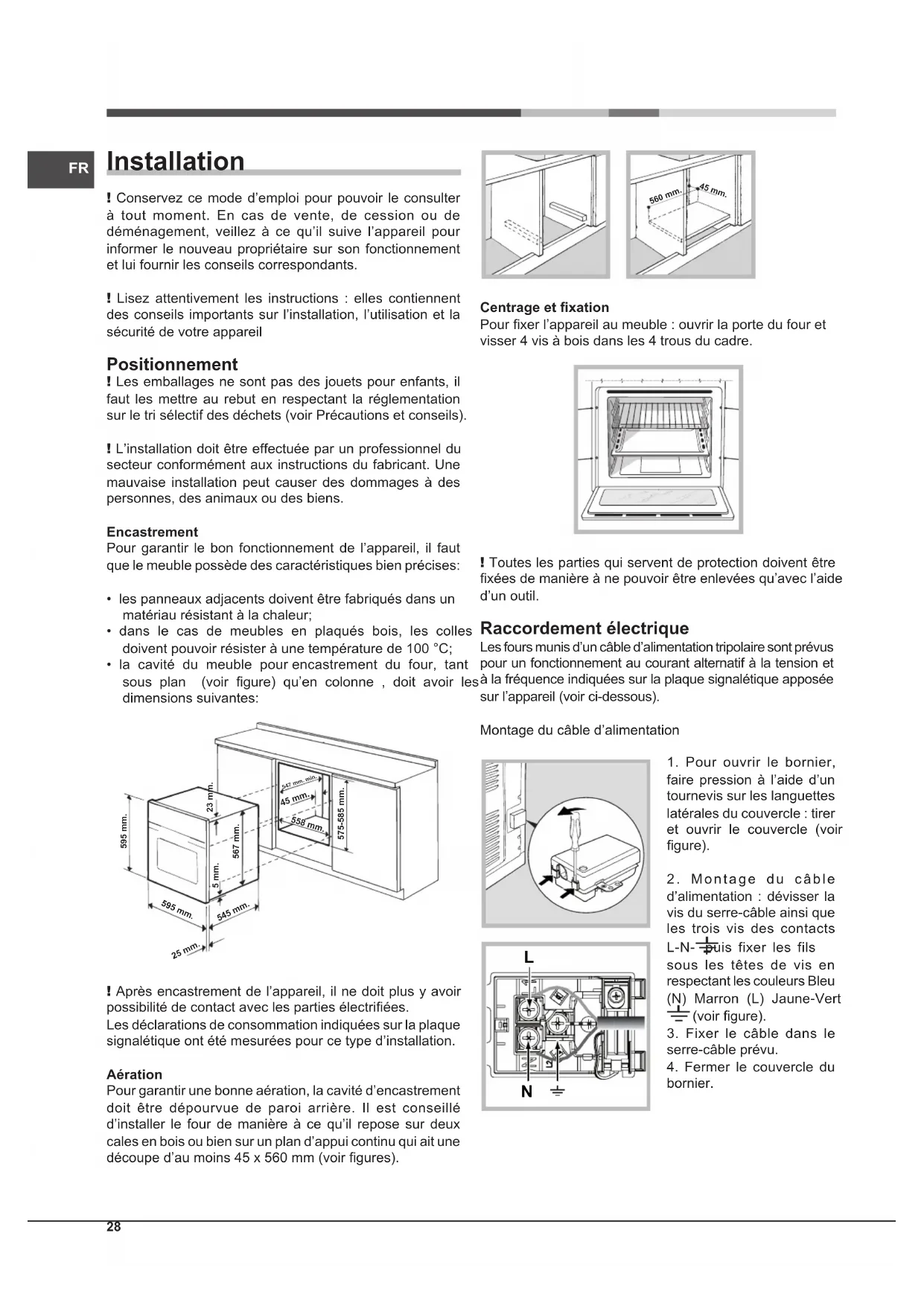 - la cavité du meuble pour encastrement du four, tant sous plan (voir gure) qu’en colonne , doit avoir les dimensions suivantes: 595 mm. 595 mm. 25 mm. 545 mm.5 mm.567 mm.23 mm.575-585 mm.45 mm.558 mm. 547 mm. min. ! Après encastrement de l’appareil, il ne doit plus y avoir possibilité de contact avec les parties électriées. Les déclarations de consommation indiquées sur la plaque signalétique ont été mesurées pour ce type d’installation. Aération Pour garantir une bonne aération, la cavité d’encastrement doit être dépourvue de paroi arrière. Il est conseillé d’installer le four de manière à ce qu’il repose sur deux cales en bois ou bien sur un plan d’appui continu qui ait une découpe d’au moins 45 x 560 mm (voir gures). 560 mm. 45 mm. Centrage et xation Pour xer l’appareil au meuble : ouvrir la porte du four et visser 4 vis à bois dans les 4 trous du cadre. ! Toutes les parties qui servent de protection doivent être xées de manière à ne pouvoir être enlevées qu’avec l’aide d’un outil. Raccordement électrique Les fours munis d’un câble d’alimentation tripolaire sont prévus pour un fonctionnement au courant alternatif à la tension et à la fréquence indiquées sur la plaque signalétique apposée sur l’appareil (voir ci-dessous). Montage du câble d’alimentation