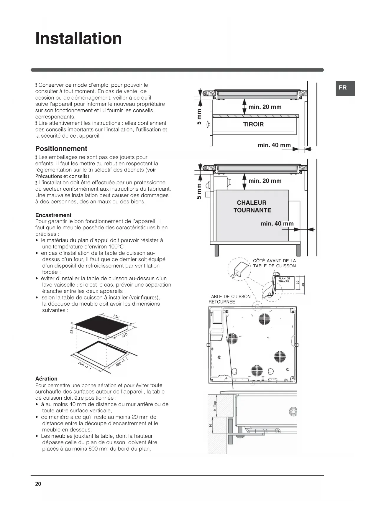- Les meubles jouxtant la table, dont la hauteur dépasse celle du plan de cuisson, doivent être placés à au moins 600 mm du bord du plan. 5 mm min. 20 mm min. 20 mm min. 40 mm TIROIR 5 mm min. 40 mm CHALEUR TOURNANTE