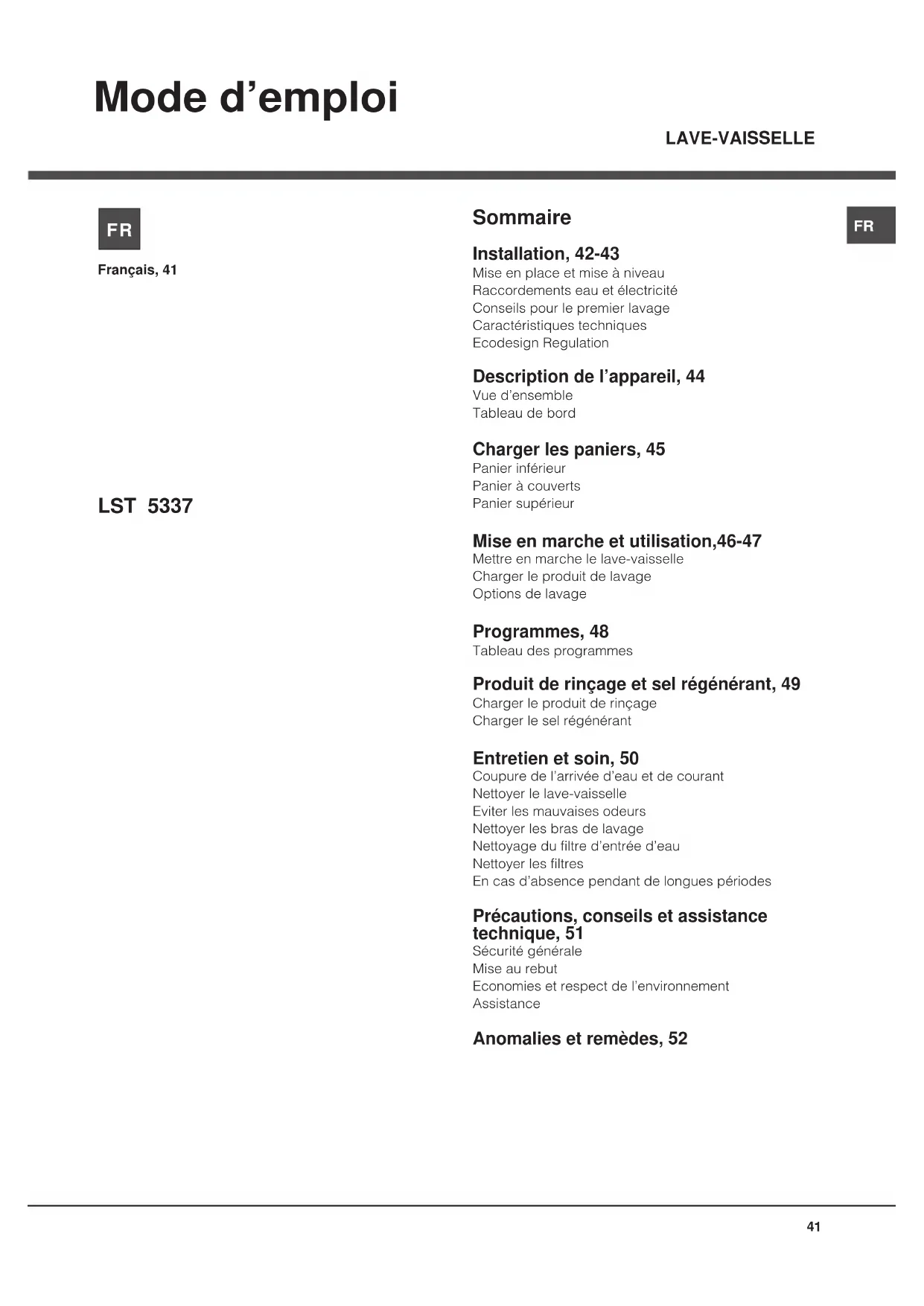 Mode d’emploi Sommaire Installation, 42-43 Mise en place et mise à niveau Raccordements eau et électricité Conseils pour le premier lavage Caractéristiques techniques Ecodesign Regulation Description de l’appareil, 44 Vue d’ensemble Tableau de bord Charger les paniers, 45 Panier inférieur Panier à couverts Panier supérieur Mise en marche et utilisation,46-47 Mettre en marche le lave-vaisselle Charger le produit de lavage Options de lavage Programmes, 48 Tableau des programmes Produit de rinçage et sel régénérant, 49 Charger le produit de rinçage Charger le sel régénérant Entretien et soin, 50 Coupure de l’arrivée d’eau et de courant Nettoyer le lave-vaisselle Eviter les mauvaises odeurs Nettoyer les bras de lavage Nettoyage du filtre d’entrée d’eau Nettoyer les filtres En cas d’absence pendant de longues périodes Précautions, conseils et assistance technique, 51 Sécurité générale Mise au rebut Economies et respect de l’environnement Assistance Anomalies et remèdes, 52 Français, 41