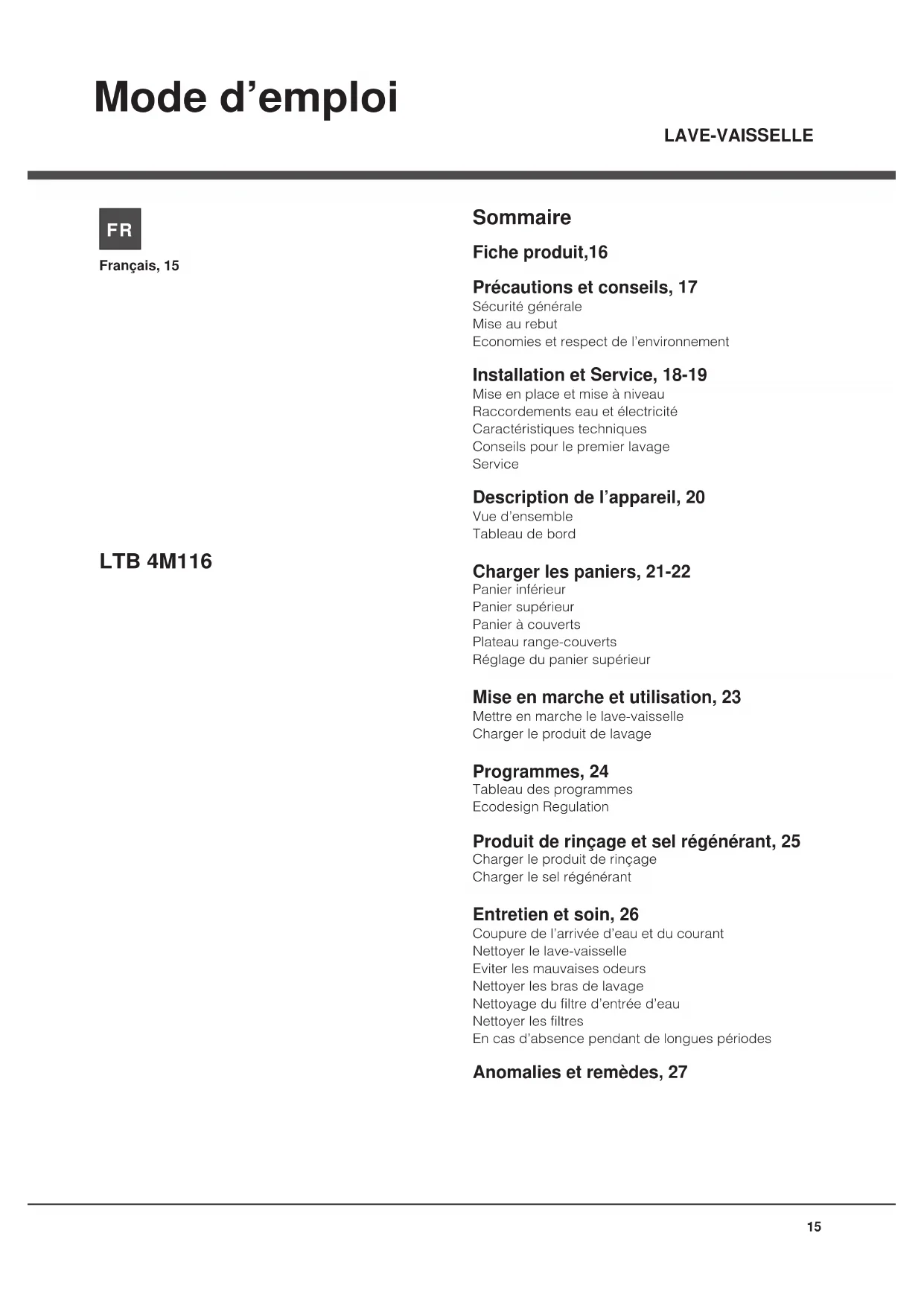 LTB 4M116 Sommaire Fiche produit,16 Précautions et conseils, 17 Sécurité générale Mise au rebut Economies et respect de l’environnement Installation et Service, 18-19 Mise en place et mise à niveau Raccordements eau et électricité Caractéristiques techniques Conseils pour le premier lavage Service Description de l’appareil, 20 Vue d’ensemble Tableau de bord Charger les paniers, 21-22 Panier inférieur Panier supérieur Panier à couverts Plateau range-couverts Réglage du panier supérieur Mise en marche et utilisation, 23 Mettre en marche le lave-vaisselle Charger le produit de lavage Programmes, 24 Tableau des programmes Ecodesign Regulation Produit de rinçage et sel régénérant, 25 Charger le produit de rinçage Charger le sel régénérant Entretien et soin, 26 Coupure de l’arrivée d’eau et du courant Nettoyer le lave-vaisselle Eviter les mauvaises odeurs Nettoyer les bras de lavage Nettoyage du filtre d’entrée d’eau Nettoyer les filtres En cas d’absence pendant de longues périodes Anomalies et remèdes, 27
