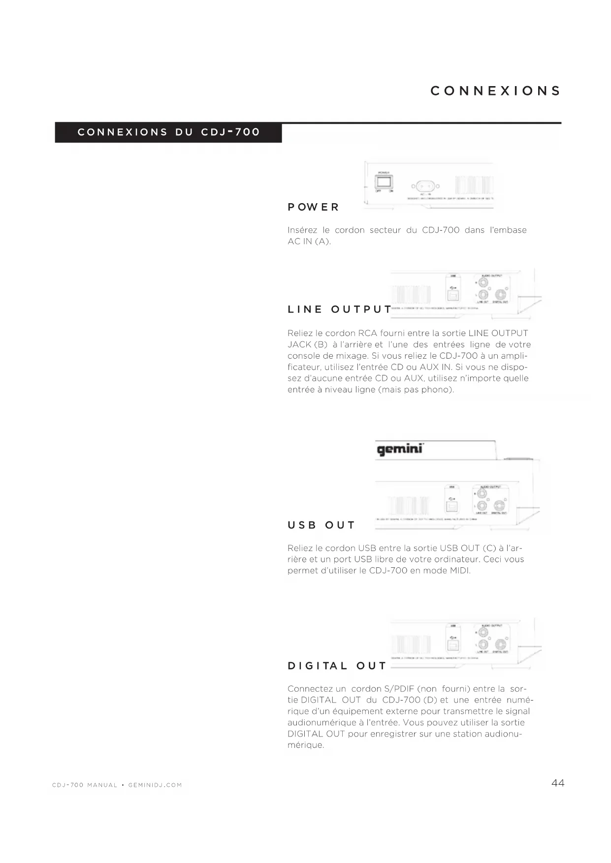 p ow e r Insérez le cordon secteur du CDJ-700 dans l’embase AC IN (A). l i n e o u t p u t Reliez le cordon RCA fourni entre la sortie LINE OUTPUT JACK (B) à l’arrière et l’une des entrées ligne de votre console de mixage. Si vous reliez le CDJ-700 à un ampli- ficateur, utilisez l’entrée CD ou AUX IN. Si vous ne dispo- sez d’aucune entrée CD ou AUX, utilisez n’importe quelle entrée à niveau ligne (mais pas phono). u s b o u t Reliez le cordon USB entre la sortie USB OUT (C) à l’ar- rière et un port USB libre de votre ordinateur. Ceci vous permet d’utiliser le CDJ-700 en mode MIDI. d i g i ta l o u t Connectez un cordon S/PDIF (non fourni) entre la sor- tie DIGITAL OUT du CDJ-700 (D) et une entrée numé- rique d’un équipement externe pour transmettre le signal audionumérique à l’entrée. Vous pouvez utiliser la sortie DIGITAL OUT pour enregistrer sur une station audionu- mérique. c o n n e x i o n s c o n n e x i o n s d u c d j - 7 0 0c d j - 7 0 0 m a n u a l • g e m i n i d j . c o m