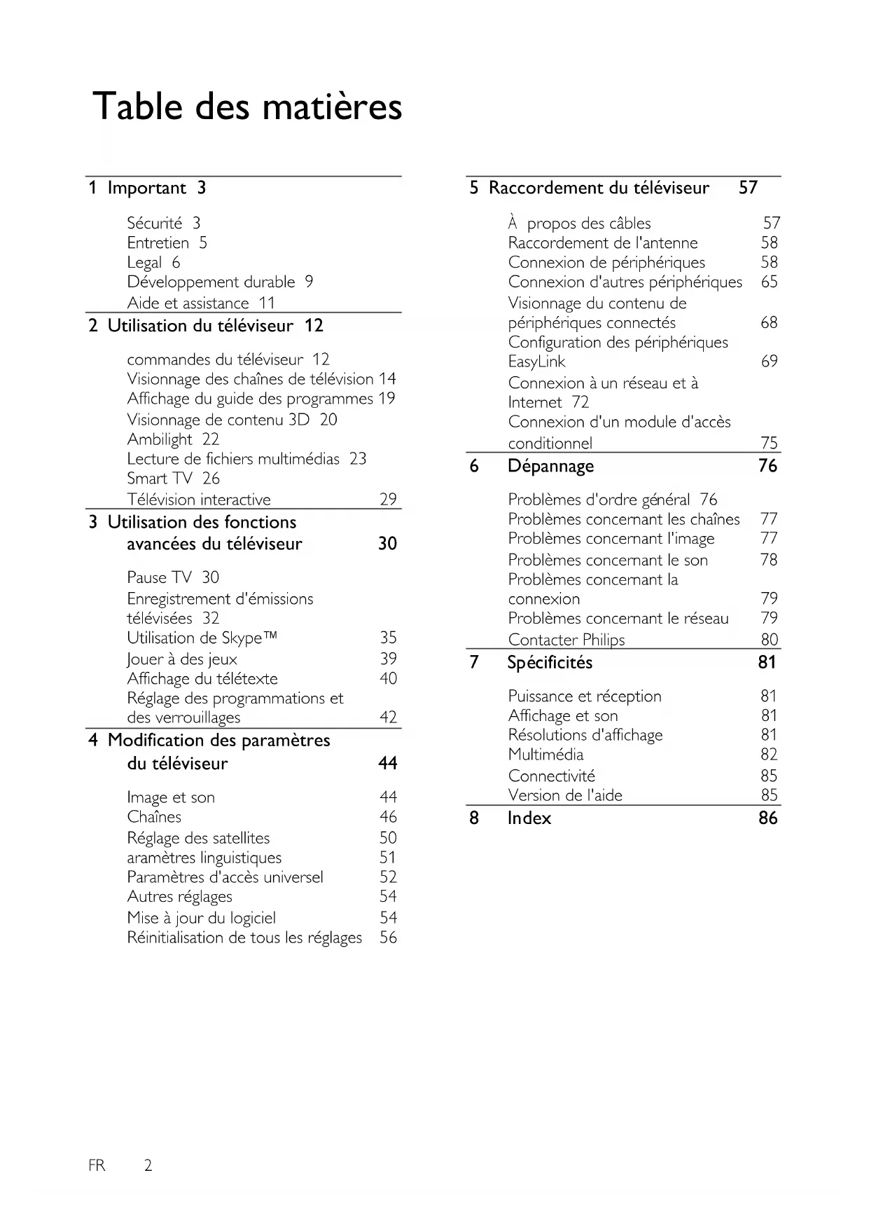 Register your product and get support at www.philips.com/welcome PFL50x8H/12 PFL50x8K/12 PFL50x8T/12 PFL50x8T/60 PFL50x8M/08FR 2 1 Important 3 Sécurité 3 Entretien 5 Legal 6 Développement durable 9 Aide et assistance 11 2 Utilisation du téléviseur 12 commandes du téléviseur 12 Visionnage des chaînes de télévision 14 Affichage du guide des programmes 19 Visionnage de contenu 3D 20 Ambilight 22 Lecture de fichiers multimédias 23 Smart TV 26 Télévision interactive 29 3 Utilisation des fonctions avancées du téléviseur 30 Pause TV 30 Enregistrement d'émissions télévisées 32 Utilisation de Skype™ 35 Jouer à des jeux 39 Affichage du télétexte 40 Réglage des programmations et des verrouillages 42 4 Modification des paramètres du téléviseur 44 Image et son 44 Chaînes 46 Réglage des satellites 50 aramètres linguistiques 51 Paramètres d'accès universel 52 Autres réglages 54 Mise à jour du logiciel 54 Réinitialisation de tous les réglages 56 5 Raccordement du téléviseur 57 À propos des câbles 57 Raccordement de l'antenne 58 Connexion de périphériques 58 Connexion d'autres périphériques 65 Visionnage du contenu de périphériques connectés 68 Configuration des périphériques EasyLink 69 Connexion à un réseau et à Internet 72 Connexion d'un module d'accès conditionnel 75 6 Dépannage 76 Problèmes d'ordre général 76 Problèmes concernant les chaînes 77 Problèmes concernant l'image 77 Problèmes concernant le son 78 Problèmes concernant la connexion 79 Problèmes concernant le réseau 79 Contacter Philips 80 7 Spécificités 81 Puissance et réception 81 Affichage et son 81 Résolutions d'affichage 81 Multimédia 82 Connectivité 85 Version de l'aide 85 8 Index 86 Table des matièresFR 3 français 1 Important Sécurité Précautions Veuillez lire et vous assurer de comprendre toutes les instructions avant d'utiliser le téléviseur. Si le produit est endommagé suite au non respect de ces instructions, la garantie ne s'appliquera pas. Risque d'électrocution ou d'incendie ! N'exposez jamais le téléviseur à la pluie ni à l'eau. Ne placez jamais de récipients contenant du liquide, tels que des vases, à proximité du téléviseur. En cas de renversement de liquide sur ou dans le téléviseur, débranchez immédiatement l'appareil. Contactez le service d'assistance clientèle Philips pour faire vérifier le téléviseur avant de l'utiliser. Ne placez jamais le téléviseur, la télécommande ni les piles à proximité d'une flamme nue ou d'une autre source de chaleur, telle que la lumière directe du soleil. Pour éviter la propagation du feu, gardez toujours les bougies et autres flammes à distance du téléviseur, de la télécommande et des piles. N'insérez jamais d'objets dans les orifices de ventilation ni dans les autres ouvertures du téléviseur. N'exposez jamais la télécommande ni les piles à la pluie, à l'eau ou à une chaleur excessive. Évitez les pressions sur la fiche d'alimentation. Vérifiez que la fiche d'alimentation est insérée à fond dans la prise secteur. Une fiche d'alimentation mal fixée peut provoquer la formation d'un arc électrique ou d'un incendie. Lorsque vous faites pivoter le téléviseur, assurez-vous qu'aucune tension n'est exercée sur le câble d'alimentation. La tension du câble d'alimentation risque de desserrer les connexions et de provoquer la formation d'un arc électrique. Pour débrancher le téléviseur, retirez la fiche d'alimentation de la prise secteur. Lorsque vous retirez le câble d'alimentation, tirez toujours sur la fiche, jamais sur le câble. Veillez à ce que la fiche d'alimentation, le câble d'alimentation et la prise secteur soient accessibles en permanence. Risque d'endommagement du téléviseur ! Deux personnes seront nécessaires pour porter le téléviseur, qui pèse plus de 25 kilos (55 livres). Si vous montez le téléviseur sur pied, utilisez uniquement le socle fourni. Fixez fermement le pied au téléviseur. Placez le téléviseur sur une surface plane et solide capable de supporter à la fois le poids du téléviseur et celui du pied. Si vous fixez le téléviseur au mur, utilisez uniquement un support mural capable de supporter le poids du téléviseur. Fixez le support mural sur un mur capable de supporter à la fois le poids du téléviseur et celui du support. TP Vision Netherlands B.V. décline toute responsabilité en cas de montage mural incorrect ayant occasionné un accident, des blessures ou des dommages. Si vous devez entreposer le téléviseur, démontez le pied de l'appareil. Ne couchez jamais le téléviseur avec le pied installé.FR 4 Avant de brancher le téléviseur sur la prise secteur, vérifiez que la tension d'alimentation correspond à la valeur indiquée à l'arrière de l'appareil. Ne branchez jamais le téléviseur sur la prise secteur si la tension est différente. Certains composants de ce produit peuvent être fabriqués à base de verre. Manipulez l'appareil avec soin pour éviter les dommages et les blessures. Risque de blessures pour les enfants ! Suivez ces instructions pour éviter que le téléviseur ne se renverse et ne blesse les enfants : Ne placez jamais le téléviseur sur une surface recouverte d'un tissu ou d'un autre support susceptible d'être tiré. Assurez-vous qu'aucune partie du téléviseur ne dépasse de la surface sur laquelle il est posé. Ne placez jamais le téléviseur sur un meuble de haute dimension (comme une bibliothèque) sans fixer à la fois le meuble et le téléviseur au mur ou à un support adéquat. Mettez les enfants en garde contre le danger de grimper sur un meuble pour atteindre le téléviseur. Risque d'ingestion des piles ! L'appareil/La télécommande peut contenir une pile bouton susceptible d'être ingérée. Conservez la pile hors de portée des enfants en permanence. Risque de surchauffe ! N'installez jamais le téléviseur dans un espace confiné. Laissez un espace d'au moins 10 cm (4") autou