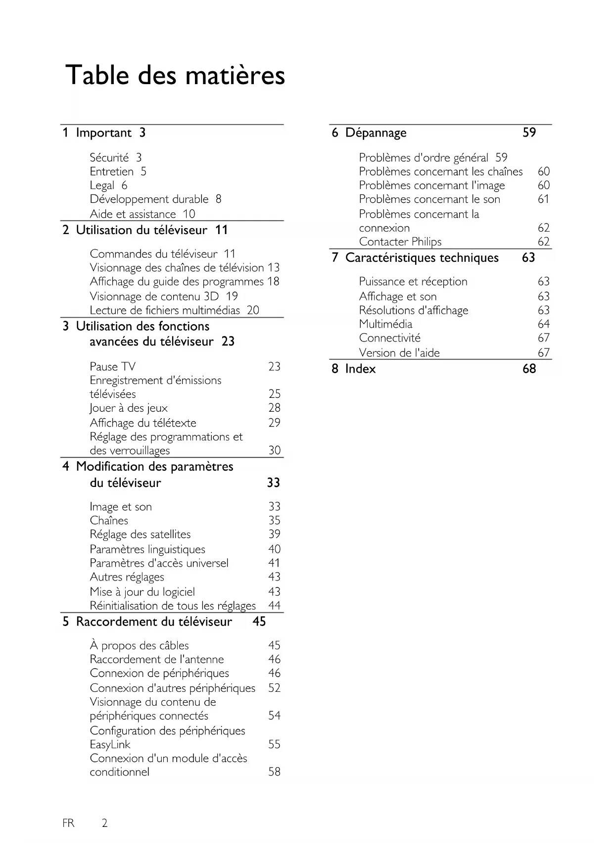 Register your product and get support at www.philips.com/welcome PFL43x8 PFL31x8 PFL30x8FR 2 1 Important 3 Sécurité 3 Entretien 5 Legal 6 Développement durable 8 Aide et assistance 10 2 Utilisation du téléviseur 11 Commandes du téléviseur 11 Visionnage des chaînes de télévision 13 Affichage du guide des programmes 18 Visionnage de contenu 3D 19 Lecture de fichiers multimédias 20 3 Utilisation des fonctions avancées du téléviseur 23 Pause TV 23 Enregistrement d'émissions télévisées 25 Jouer à des jeux 28 Affichage du télétexte 29 Réglage des programmations et des verrouillages 30 4 Modification des paramètres du téléviseur 33 Image et son 33 Chaînes 35 Réglage des satellites 39 Paramètres linguistiques 40 Paramètres d'accès universel 41 Autres réglages 43 Mise à jour du logiciel 43 Réinitialisation de tous les réglages 44 5 Raccordement du téléviseur 45 À propos des câbles 45 Raccordement de l'antenne 46 Connexion de périphériques 46 Connexion d'autres périphériques 52 Visionnage du contenu de périphériques connectés 54 Configuration des périphériques EasyLink 55 Connexion d'un module d'accès conditionnel 58 6 Dépannage 59 Problèmes d'ordre général 59 Problèmes concernant les chaînes 60 Problèmes concernant l'image 60 Problèmes concernant le son 61 Problèmes concernant la connexion 62 Contacter Philips 62 7 Caractéristiques techniques 63 Puissance et réception 63 Affichage et son 63 Résolutions d'affichage 63 Multimédia 64 Connectivité 67 Version de l'aide 67 8 Index 68 Table des matièresFR 3 Français 1 Important Sécurité Précautions Veuillez lire et vous assurer de comprendre toutes les instructions avant d'utiliser le téléviseur. Si le produit est endommagé suite au non respect de ces instructions, la garantie ne s'appliquera pas. Risque d'électrocution ou d'incendie ! N'exposez jamais le téléviseur à la pluie ni à l'eau. Ne placez jamais de récipients contenant du liquide, tels que des vases, à proximité du téléviseur. En cas de renversement de liquide sur ou dans le téléviseur, débranchez immédiatement l'appareil. Contactez le service d'assistance clientèle Philips pour faire vérifier le téléviseur avant de l'utiliser. Ne placez jamais le téléviseur, la télécommande ni les piles à proximité d'une flamme nue ou d'une autre source de chaleur, telle que la lumière directe du soleil. Pour éviter la propagation du feu, gardez toujours les bougies et autres flammes à distance du téléviseur, de la télécommande et des piles.