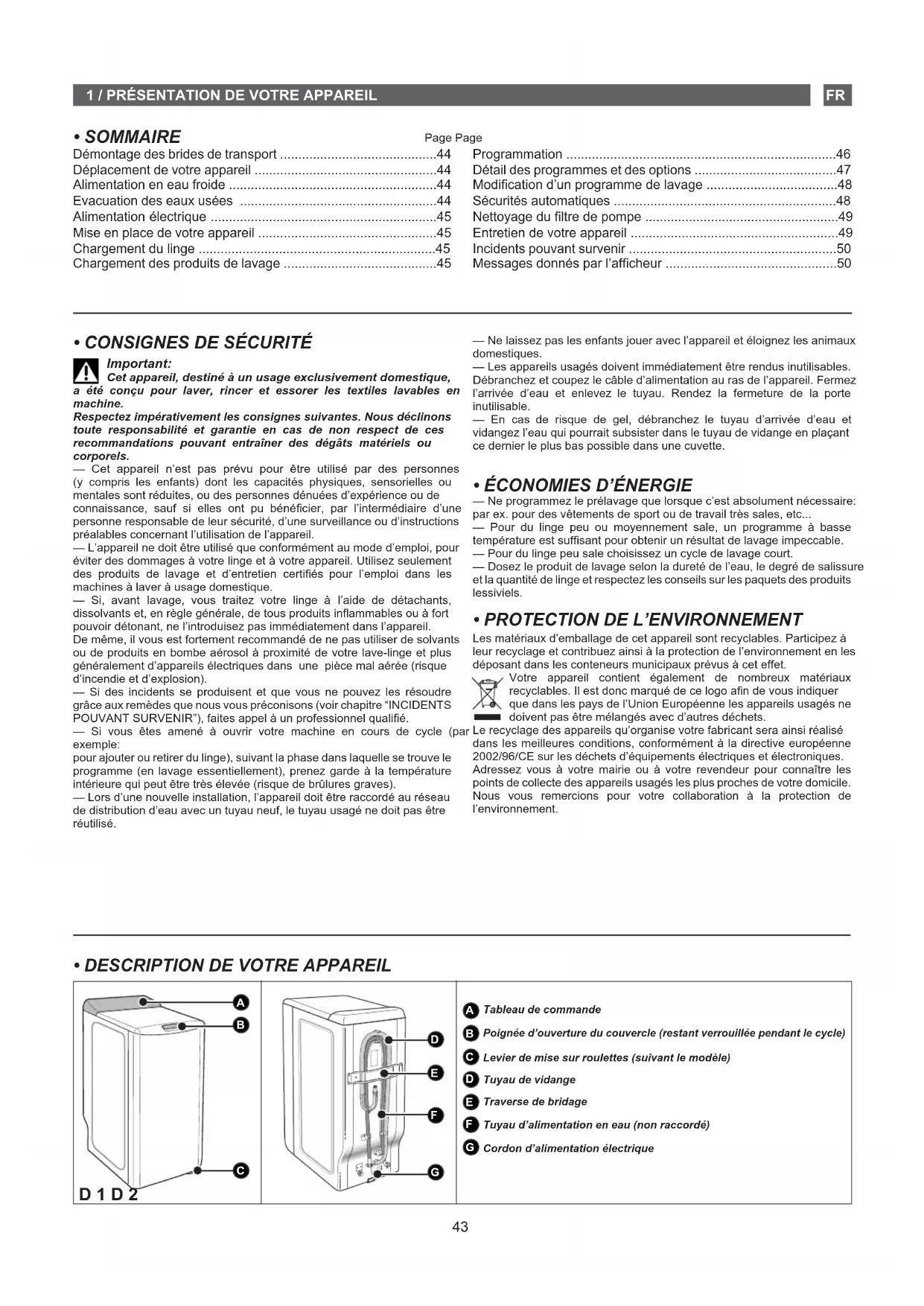 compris les enfants) dont les capacités physiques, sensorielles ou mentales sont réduites, ou des personnes dénuées d’expérience ou de connaissance, sauf si elles ont pu bénécier, par l’intermédiaire d’une personne responsable de leur sécurité, d’une surveillance ou d’instructions préalables concernant l’utilisation de l’appareil. — L’appareil ne doit être utilisé que conformément au mode d’emploi, pour éviter des dommages à votre linge et à votre appareil. Utilisez seulement des produits de lavage et d’entretien certiés pour l’emploi dans les machines à laver à usage domestique. — Si, avant lavage, vous traitez votre linge à l’aide de détachants, dissolvants et, en règle générale, de tous produits inammables ou à fort pouvoir détonant, ne l’introduisez pas immédiatement dans l’appareil. De même, il vous est fortement recommandé de ne pas utiliser de solvants ou de produits en bombe aérosol à proximité de votre lave-linge et plus généralement d’appareils électriques dans une pièce mal aérée (risque d’incendie et d’explosion). — Si des incidents se produisent et que vous ne pouvez les résoudre grâce aux remèdes que nous vous préconisons (voir chapitre “INCIDENTS POUVANT SURVENIR”), faites appel à un professionnel qualié. — Si vous êtes amené à ouvrir votre machine en cours de cycle (par exemple: pour ajouter ou retirer du linge), suivant la phase dans laquelle se trouve le programme (en lavage essentiellement), prenez garde à la température intérieure qui peut être très élevée (risque de brûlures graves). — Lors d’une nouvelle installation, l’appareil doit être raccordé au réseau de distribution d’eau avec un tuyau neuf, le tuyau usagé ne doit pas être réutilisé. — Ne laissez pas les enfants jouer avec l’appareil et éloignez les animaux domestiques. — Les appareils usagés doivent immédiatement être rendus inutilisables. Débranchez et coupez le câble d’alimentation au ras de l’appareil. Fermez l’arrivée d’eau et enlevez le tuyau. Rendez la fermeture de la porte inutilisable. — En cas de risque de gel, débranchez le tuyau d’arrivée d’eau et vidangez l’eau qui pourrait subsister dans le tuyau de vidange en plaçant ce dernier le plus bas possible dans une cuvette.