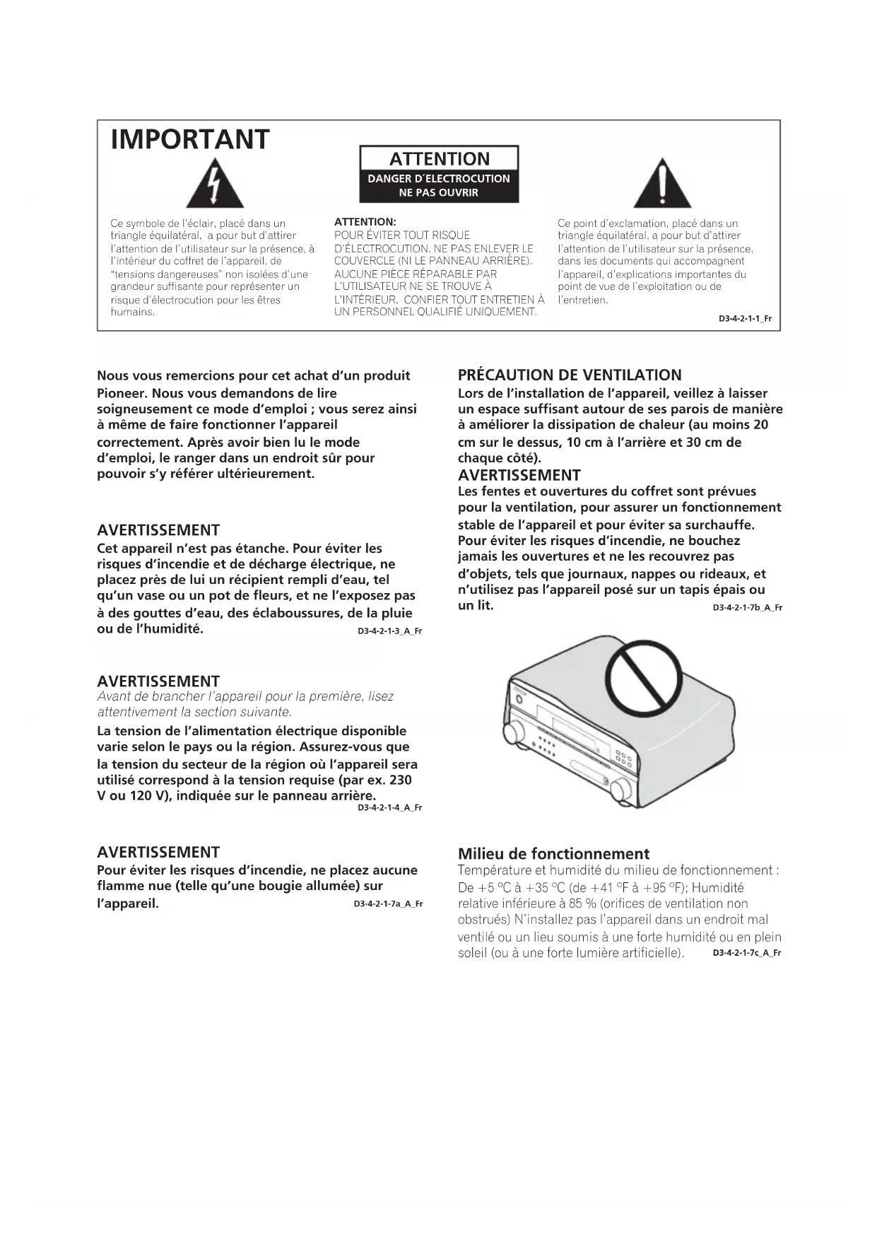 soleil (ou à une forte lumière artificielle). D3-4-2-1-7c_A_Fr VSX_418_MY_French.book Page 2 Thursday, December 27, 2007 2:26 PMDOWNDOWNDOWNCe point d’exclamation, placé dans un triangle équilatéral, a pour but d’attirer l’attention de l’utilisateur sur la présence, dans les documents qui accompagnent l’appareil, d’explications importantes du point de vue de l’exploitation ou de l’entretien.Ce symbole de l’éclair, placé dans un triangle équilatéral, a pour but d’attirer l’attention de l’utilisateur sur la présence, à l’intérieur du coffret de l’appareil, de “tensions dangereuses” non isolées d’une grandeur suffisante pour représenter un risque d’électrocution pour les êtres humains. IMPORTANT ATTENTION:POUR ÉVITER TOUT RISQUE D’ÉLECTROCUTION, NE PAS ENLEVER LE COUVERCLE (NI LE PANNEAU ARRIÈRE).