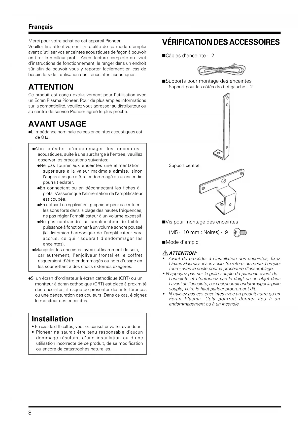 8 Merci pour votre achat de cet appareil Pioneer.Veuillez lire attentivement la totalite de ce mode d’emploiavant d’utiliser vos enceintes acoustiques de façon à pouvoiren tirer le meilleur profit. Après lecture complète du livretd’instructions de fonctionnement, le ranger dans un endroitsûr afin de pouvoir vous y reporter facilement en cas debesoin lors de l’utilisation des l’enceintes acoustiques. ATTENTION Ce produit est conçu exclusivement pour l’utilisation avecun Écran Plasma Pioneer. Pour de plus amples informationssur la compatibilité, veuillez vous adresser au distributeur ouau centre de service Pioneer agréé le plus proche. AVANT USAGE ÷ L’impédance nominale de ces enceintes acoustiques estde 8 Ω.÷ Afin d’éviter d’endommager les enceintesacoustiques, suite à une surcharge à l’entrée, veuillezobserver les précautions suivantes:÷ Ne pas fournir aux enceintes une alimentationsupérieure à la valeur maximale admise, sinonl’appareil risque d’être endommagé ou un incendiepourrait éclater.÷ En connectant ou en déconnectant les fiches àplots, s’assurer que l’alimentation de l’amplificateurest coupée.÷ En utilisant un égalisateur graphique pour accentuerles sons forts dans la plage des hautes fréquences,ne pas régler l’amplificateur à un volume excessif.÷ Ne pas contraindre un amplificateur de faiblepuissance à fonctionner à un volume sonore poussé(la distorsion harmonique de l’amplificateur seraaccrue, ce qui risquerait d’endommager lesenceintes).÷ Manipuler les enceintes avec suffisamment de soin,car autrement, l’enjoliveur frontal et le coffretrisqueraient d’être endommagés ou hors d’usage enles soumettant à des chocs externes exagérés.÷ Si un écran d’ordinateur à écran cathodique (CRT) ou unmoniteur à écran cathodique (CRT) est placé à proximitédes enceintes, il risque de présenter des interférencesou une dénaturation des couleurs. Dans ce cas, éloignezle moniteur des enceintes. Installation • En cas de difficultés, veuillez consulter votre revendeur.• Pioneer ne saurait être tenu responsable d’aucundommage résultant d’une installation ou d’uneutilisation incorrecte de ce produit, de sa modificationou encore de catastrophes naturelles. VÉRIFICATION DES ACCESSOIRES