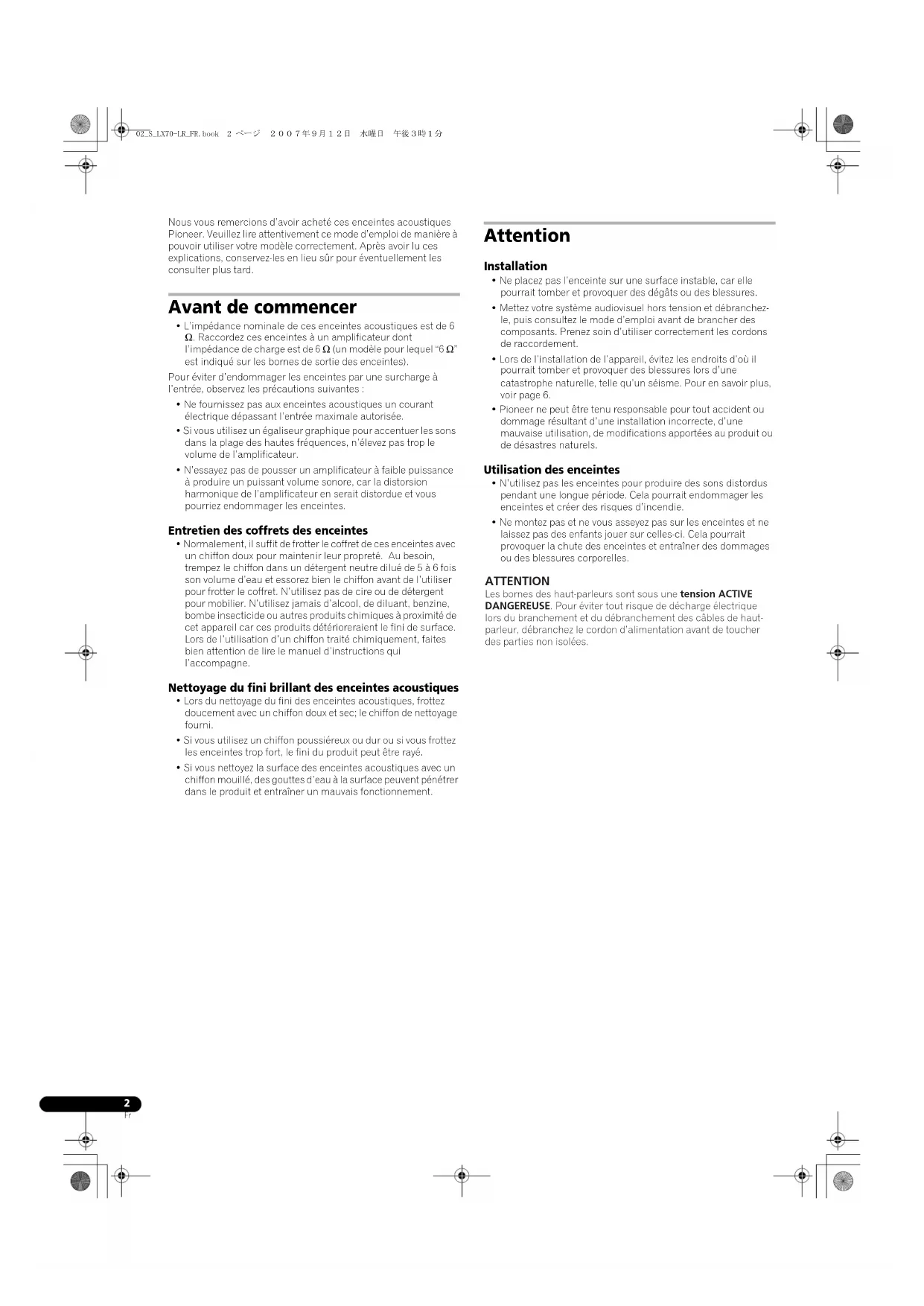 Fr Nous vous remercions d’avoir acheté ces enceintes acoustiques Pioneer. Veuillez lire attentivement ce mode d’emploi de manière à pouvoir utiliser votre modèle correctement. Après avoir lu ces explications, conservez-les en lieu sûr pour éventuellement les consulter plus tard. Avant de commencer • L’impédance nominale de ces enceintes acoustiques est de 6 Ω. Raccordez ces enceintes à un amplificateur dont l’impédance de charge est de 6 Ω (un modèle pour lequel “6 Ω” est indiqué sur les bornes de sortie des enceintes).Pour éviter d’endommager les enceintes par une surcharge à l’entrée, observez les précautions suivantes :• Ne fournissez pas aux enceintes acoustiques un courant électrique dépassant l’entrée maximale autorisée.• Si vous utilisez un égaliseur graphique pour accentuer les sons dans la plage des hautes fréquences, n’élevez pas trop le volume de l’amplificateur.• N’essayez pas de pousser un amplificateur à faible puissance à produire un puissant volume sonore, car la distorsion harmonique de l’amplificateur en serait distordue et vous pourriez endommager les enceintes. Entretien des coffrets des enceintes • Normalement, il suffit de frotter le coffret de ces enceintes avec un chiffon doux pour maintenir leur propreté. Au besoin, trempez le chiffon dans un détergent neutre dilué de 5 à 6 fois son volume d’eau et essorez bien le chiffon avant de l’utiliser pour frotter le coffret. N’utilisez pas de cire ou de détergent pour mobilier. N’utilisez jamais d’alcool, de diluant, benzine, bombe insecticide ou autres produits chimiques à proximité de cet appareil car ces produits détérioreraient le fini de surface. Lors de l’utilisation d’un chiffon traité chimiquement, faites bien attention de lire le manuel d’instructions qui l’accompagne. Nettoyage du fini brillant des enceintes acoustiques • Lors du nettoyage du fini des enceintes acoustiques, frottez doucement avec un chiffon doux et sec; le chiffon de nettoyage fourni.• Si vous utilisez un chiffon poussiéreux ou dur ou si vous frottez les enceintes trop fort, le fini du produit peut être rayé.• Si vous nettoyez la surface des enceintes acoustiques avec un chiffon mouillé, des gouttes d’eau à la surface peuvent pénétrer dans le produit et entraîner un mauvais fonctionnement. Attention