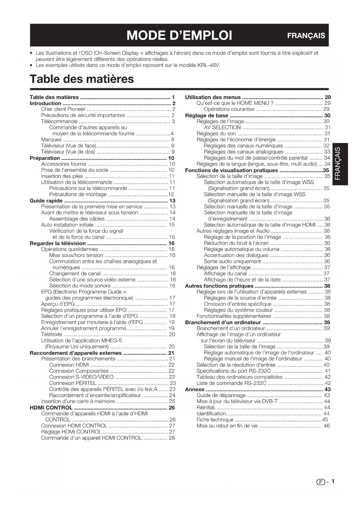 KRL46V_GB.indd 48 2008/07/09 14:09:10MODE D’EMPLOI Table des matières 1Introduction 2Cher client Pioneer 2Précautions de sécurité importantes 2Télécommande 3Commande d’autres appareils au moyen de la télécommande fournie 4Marques 8Téléviseur (Vue de face) 9Téléviseur (Vue de dos) 9Préparation 10Accessoires fournis 10Pose de l’ensemble du socle 10Insertion des piles 11Utilisation de la télécommande 11Précautions sur la télécommande 11Précautions de montage 12Guide rapide 13Présentation de la première mise en service 13Avant de mettre le téléviseur sous tension 14Assemblage des câbles 14Auto installation initiale 15Vérification de la force du signal et de la force du canal 15Regarder la télévision 16Opérations quotidiennes 16Mise sous/hors tension 16Commutation entre les chaînes analogiques et numériques 16Changement de canal 16Sélection d’une source vidéo externe 16Sélection du mode sonore 16EPG (Electronic Programme Guide = guides des programmes électronique) 17Aperçu d’EPG 17Réglages pratiques pour utiliser EPG 17Sélection d’un programme à l’aide d’EPG 18Enregistrement par minuterie à l’aide d’EPG 19Annuler l’enregistrement programmé 19Télétexte 20Utilisation de l’application MHEG-5 (Royaume-Uni uniquement) 20Raccordement d’appareils externes 21Présentation des branchements 21Connexion HDMI 22Connexion Composantes 22Connexion S-VIDEO/VIDEO 22Connexion PÉRITEL 23Contrôle des appareils PÉRITEL avec i/o link.A 23Raccordement d’enceinte/amplificateur 24Insertion d’une carte à mémoire 25HDMI CONTROL 26Commande d’appareils HDMI à l’aide d’HDMI CONTROL 26Connexion HDMI CONTROL 27Réglage HDMI CONTROL 27Commande d’un appareil HDMI CONTROL 28Utilisation des menus 29Qu’est-ce que le HOME MENU ? 29Opérations courantes 29Réglage de base 30Réglages de l’image 30AV SELECTION 31Réglages du son 31Réglages de l’économie d’énergie 31Réglages des canaux numériques 32Réglages des canaux analogiques 33Réglages du mot de passe/contrôle parental 34Réglages de la langue (langue, sous-titre, multi audio) ... 34Fonctions de visualisation pratiques 35Sélection de la taille d’image 35Sélection automatique de la taille d’image WSS (Signalisation grand écran) 35Sélection manuelle de la taille d’image WSS (Signalisation grand écran) 35Sélection manuelle de la taille d’image 35Sélection manuelle de la taille d’image d’enregistrement 36Sélection automatique de la taille d’image HDMI .... 36Autres réglages Image et Audio 36Réglage de la position de l’image 36Réduction du bruit à l’écran 36Réglage automatique du volume 36Accentuation des dialogues 36Sortie audio uniquement 36Réglages de l’affichage 37Affichage du canal 37Affichage de l’heure et de la date 37Autres fonctions pratiques 38Réglage lors de l’utilisation d’appareils externes 38Réglages de la source d’entrée 38Omission d’entrée spécifique 38Réglages du système couleur 38Fonctionnalités supplémentaires 38Branchement d’un ordinateur 39Branchement d’un ordinateur 39Affichage de l’image d’un ordinateur sur l’écran du téléviseur 39Sélection de la taille de l’image 39Réglage automatique de l’image de l’ordinateur 40Réglage manuel de l’image de l’ordinateur 40Sélection de la résolution d’entrée 40Spécifications du port RS-232C 41Tableau des ordinateurs compatibles 42Liste de commande RS-232C 42Annexe 43Guide de dépannage 43Mise à jour du téléviseur via DVB-T 44Réinitial. 44Identification 44Fiche technique 45Mise au rebut en fin de vie 46