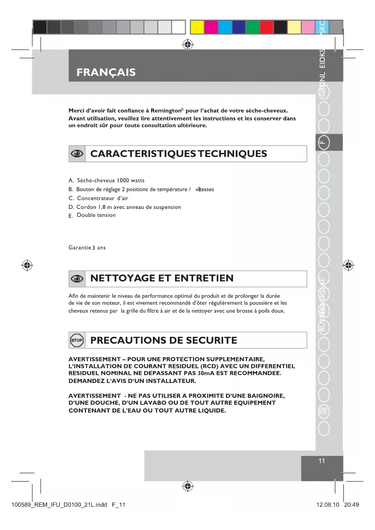 D0100 - Sèche cheveux REMINGTON - Notice d'utilisation et mode d'emploi gratuit