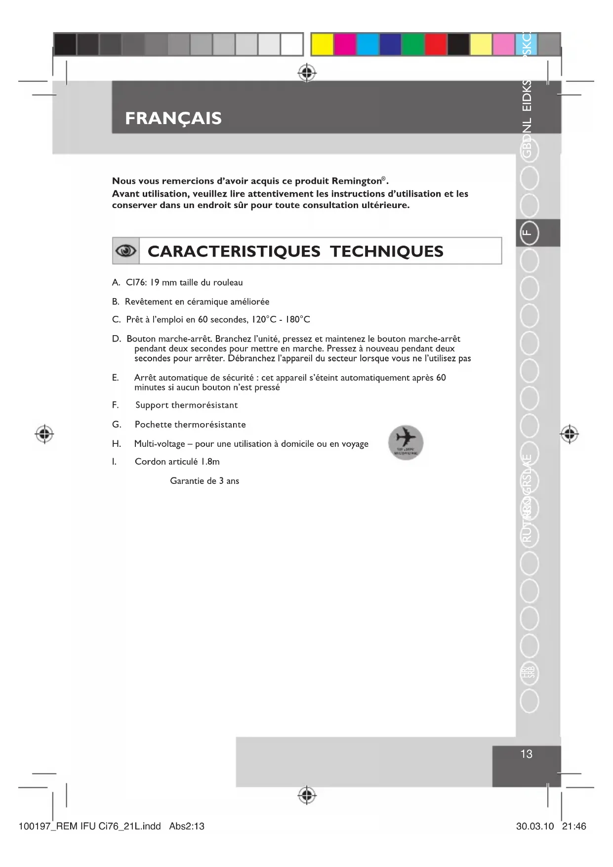 . Avant utilisation, veuillez lire attentivement les instructions d’utilisation et les conserver dans un endroit sûr pour toute consultation ultérieure. CARACTERISTIQUES TECHNIQUES A. CI76: 19 mm taille du rouleauB. Revêtement en céramique amélioréeC. Prêt à l’emploi en 60 secondes, 120°C - 180°CD. Bouton marche-arrêt. Branchez l’unité, pressez et maintenez le bouton marche-arrêt pendant deux secondes pour mettre en marche. Pressez à nouveau pendant deux secondes pour arrêter. Débranchez l’appareil du secteur lorsque vous ne l’utilisez pasE. Arrêt automatique de sécurité : cet appareil s’éteint automatiquement après 60 minutes si aucun bouton n’est presséF. Support thermorésistantG. Pochette thermorésistanteH. Multi-voltage – pour une utilisation à domicile ou en voyageI. Cordon articulé 1.8m Garantie de 3 ans 100197_REM IFU Ci76_21L.indd Abs2:13100197_REM IFU Ci76_21L.indd Abs2:13 30.03.10 21:4630.03.10 21:46FRANÇAIS