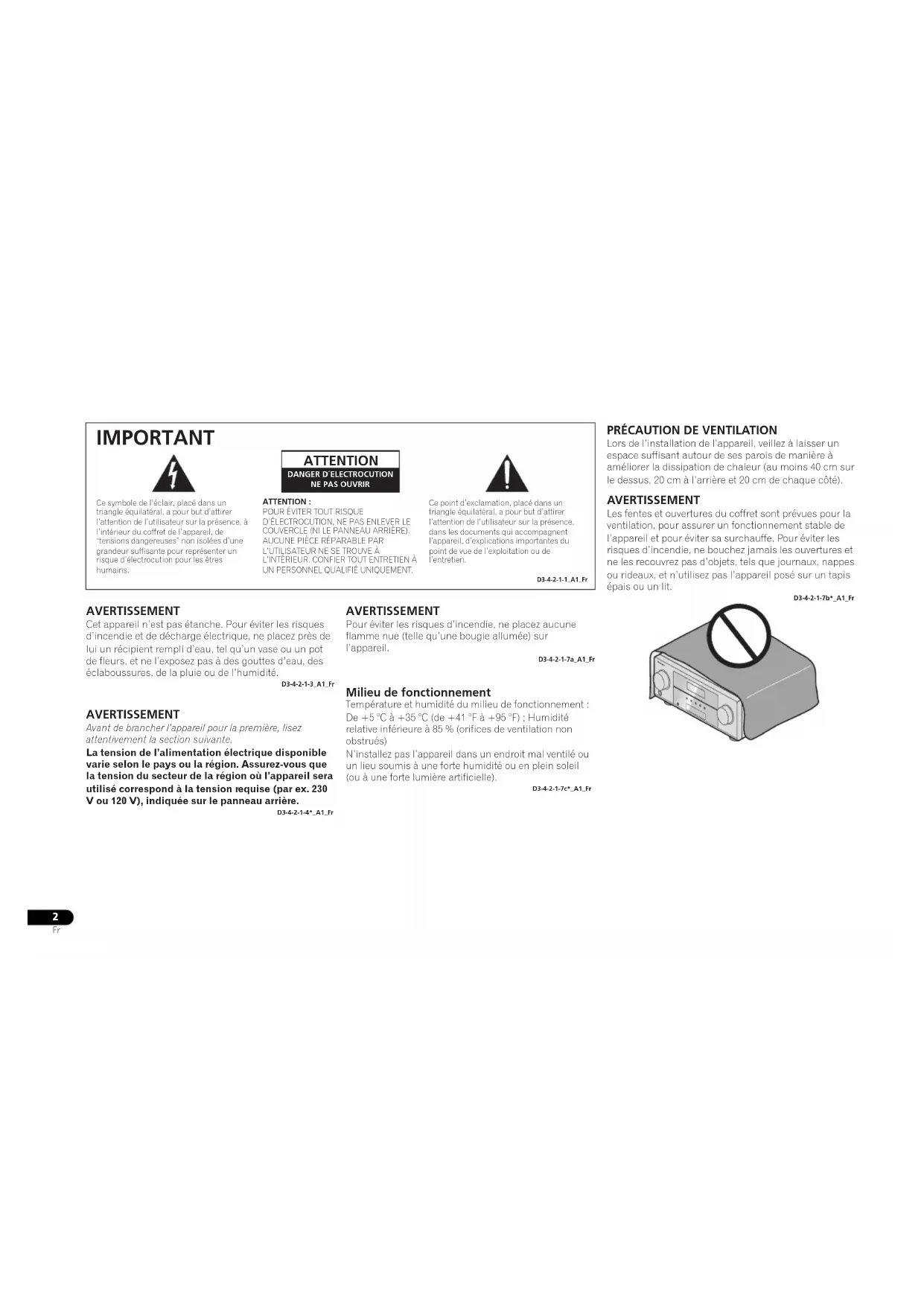 Fr Ce point d’exclamation, placé dans un triangle équilatéral, a pour but d’attirer l’attention de l’utilisateur sur la présence, dans les documents qui accompagnentl’appareil, d’explications importantes du point de vue de l’exploitation ou del’entretien.Ce symbole de l’éclair, placé dans un triangle équilatéral, a pour but d’attirer l’attention de l’utilisateur sur la présence, à l’intérieur du coffret de l’appareil, de“tensions dangereuses” non isolées d’unegrandeur suffisante pour représenter un risque d’électrocution pour les êtres humains.ATTENTION :POUR ÉVITER TOUT RISQUED’ÉLECTROCUTION, NE PAS ENLEVER LE COUVERCLE (NI LE PANNEAU ARRIÈRE).AUCUNE PIÈCE RÉPARABLE PARL’UTILISATEUR NE SE TROUVE À L’INTÉRIEUR. CONFIER TOUT ENTRETIEN À UN PERSONNEL QUALIFIÉ UNIQUEMENT. ATTENTION DANGER D´ELECTROCUTIONNE PAS OUVRIR IMPORTANT D3-4-2-1-1_A1_Fr AVERTISSEMENT Cet appareil n’est pas étanche. Pour éviter les risques d’incendie et de décharge électrique, ne placez près delui un récipient rempli d’eau, tel qu’un vase ou un potde fleurs, et ne l’exposez pas à des gouttes d’eau, des éclaboussures, de la pluie ou de l’humidité.D3-4-2-1-3_A1_Fr