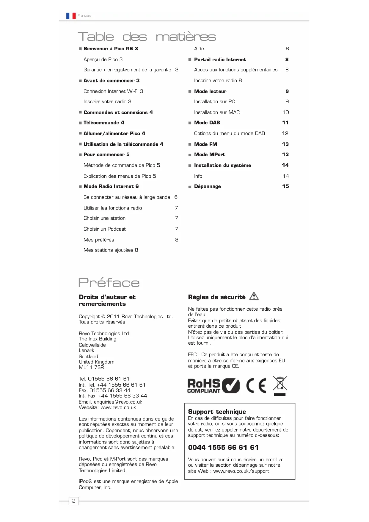 Avant de commencer 3 Connexion Internet Wi-Fi 3 Inscrire votre radio 3 Commandes et connexions 4 Télécommande 4 Allumer/alimenter Pico 4 Utilisation de la télécommande 4 Pour commencer 5 Méthode de commande de Pico 5 Explication des menus de Pico 5 Mode Radio Internet 6 Se connecter au réseau à large bande 6 Utiliser les fonctions radio 7 Choisir une station 7 Choisir un Podcast 7 Mes préférés 8 Mes stations ajoutées 8 Aide 8 Portail radio Internet 8 Accès aux fonctions supplémentaires 8 Inscrire votre radio 8 Mode lecteur 9 Installation sur PC 9 Installation sur MAC 10 Mode DAB 11 Options du menu du mode DAB 12 Mode FM 13 Mode MPort 13 Installation du système 14 Info 14 Dépannage 15 Droits d’auteur et remerciements Copyright © 2011 Revo Technologies Ltd. Tous droits réservés Revo Technologies Ltd The Inox Building Caldwellside Lanark Scotland United Kingdom ML11 7SR Tel. 01555 66 61 61 Int. Tel. +44 1555 66 61 61 Fax. 01555 66 33 44 Int. Fax. +44 1555 66 33 44 Email. enquiries@revo.co.uk Website: www.revo.co.uk Les informations contenues dans ce guide sont réputées exactes au moment de leur publication. Cependant, nous observons une politique de développement continu et ces informations sont donc sujettes à changement sans avertissement préalable. Revo, Pico et M-Port sont des marques déposées ou enregistrées de Revo Technologies Limited. iPod® est une marque enregistrée de Apple Computer, Inc. Règles de sécurité Ne faites pas fonctionner cette radio près de l’eau. Evitez que de petits objets et des liquides entrent dans ce produit. N’ôtez pas de vis ou des parties du boîtier. Utilisez uniquement le bloc d’alimentation qui est fourni. EEC : Ce produit a été conçu et testé de manière à être conforme aux exigences EU et porte la marque CE. Support technique En cas de difficultés pour faire fonctionner votre radio, ou si vous soupçonnez quelque défaut, veuillez appeler notre département de support technique au numéro ci-dessous: