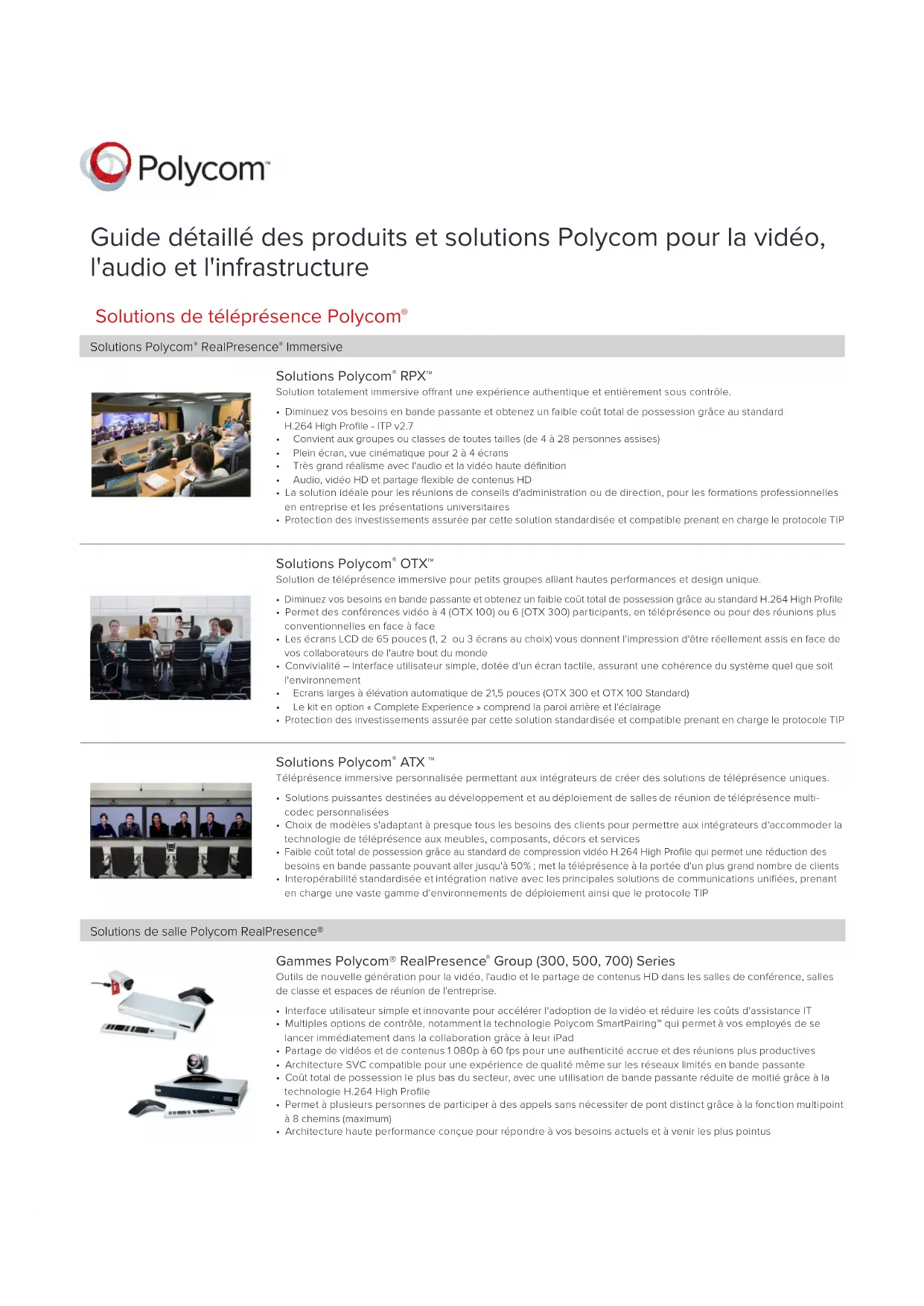 - Interopérabilité standardisée et intégration native avec les principales solutions de communications unifiées, prenant en charge une vaste gamme d'environnements de déploiement ainsi que le protocole TIP Guide détaillé des produits et solutions Polycom pour la vidéo, l'audio et l'infrastructure Solutions de téléprésence Polycom