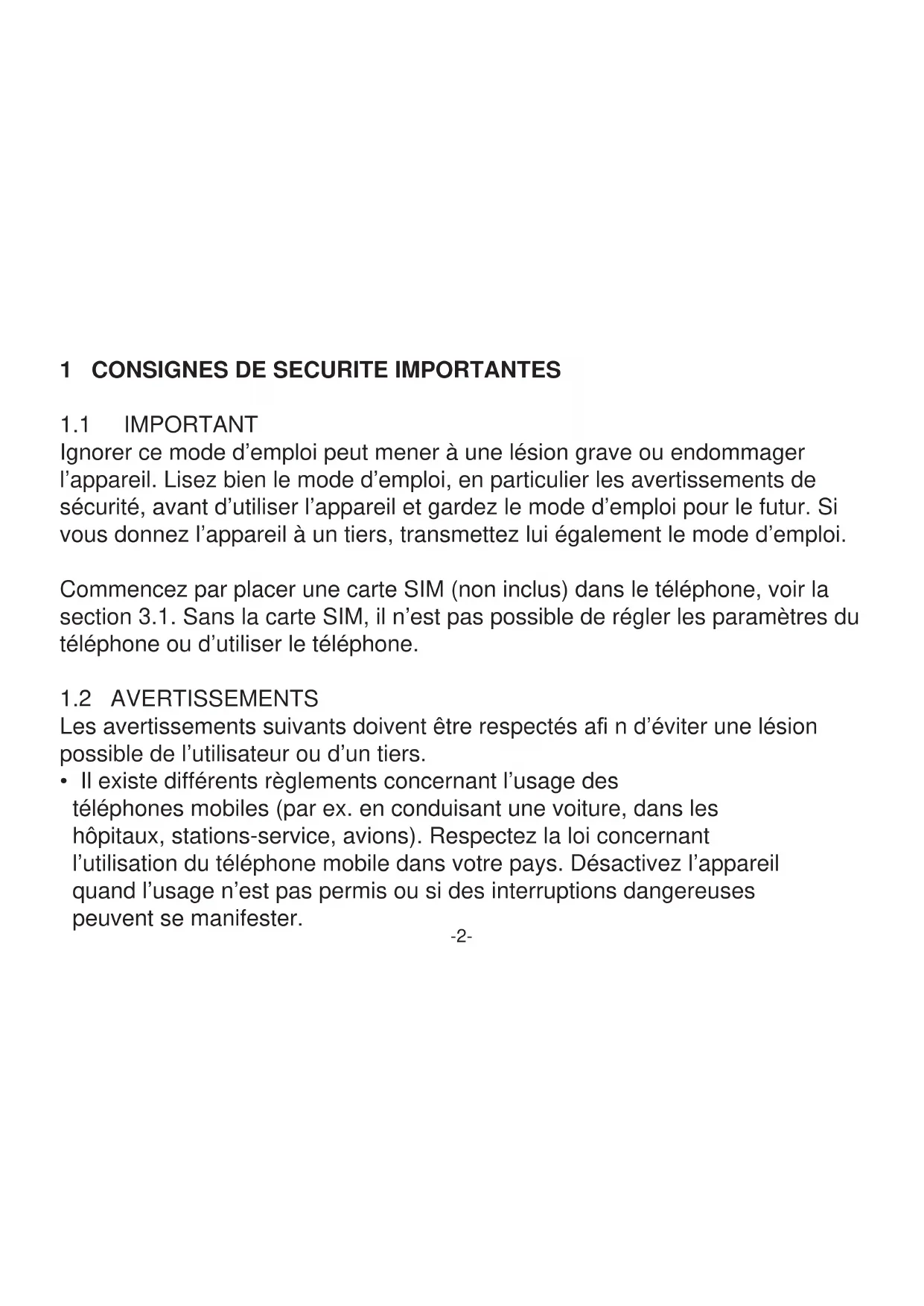 Ignorer ce mode d’emploi peut mener à une lésion grave ou endommager l’appareil. Lisez bien le mode d’emploi, en particulier les avertissements de sécurité, avant d’utiliser l’appareil et gardez le mode d’emploi pour le futur. Si vous donnez l’appareil à un tiers, transmettez lui également le mode d’emploi. Commencez par placer une carte SIM (non inclus) dans le téléphone, voir la