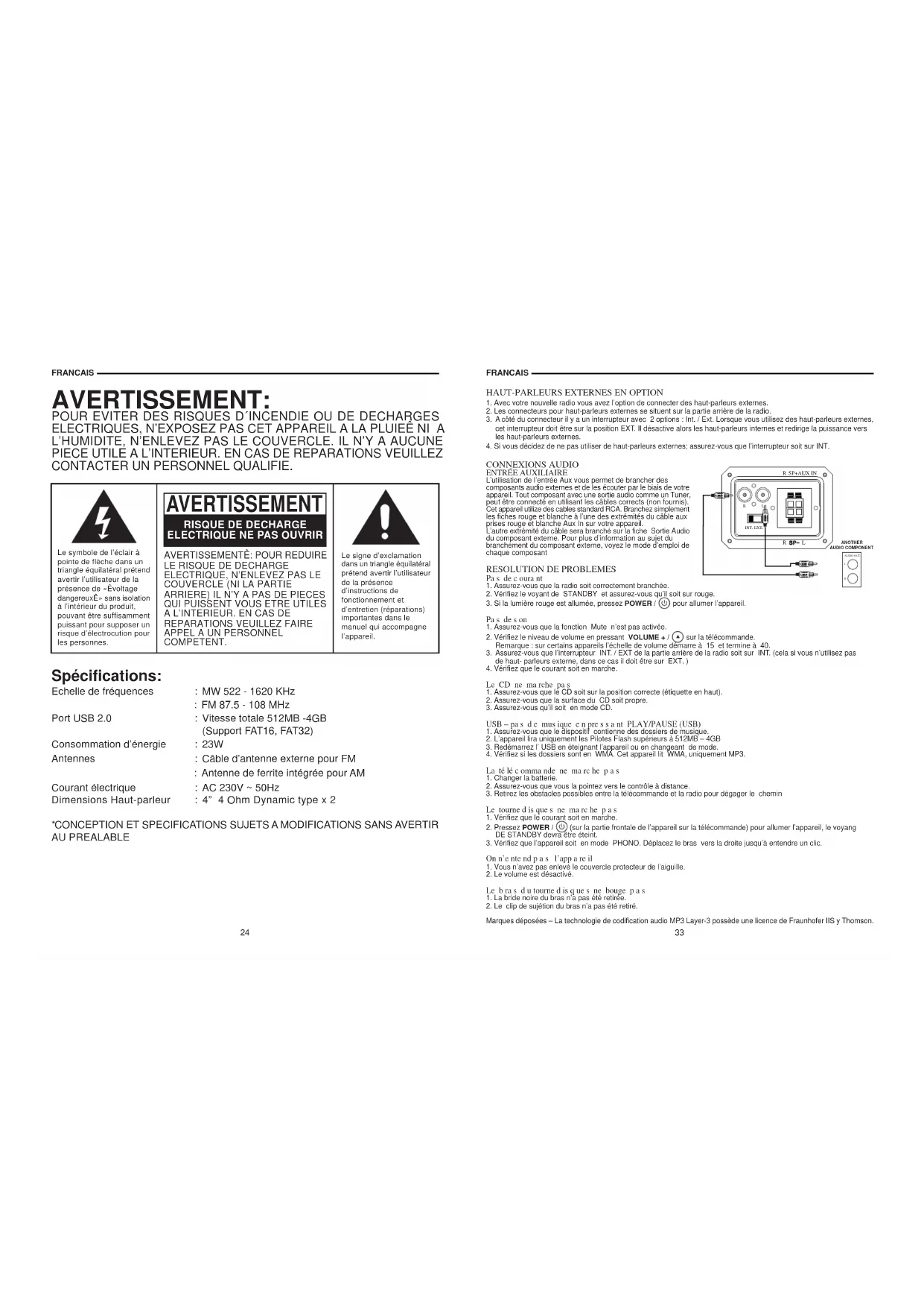 E.L'appareil est tombé ou le boitier est endommagé. - Réparations — L'usager ne doit pas tenter de réparer l'appareil au-delà de ce qui est précisément dans le present manuel. Tout le reste doit être réalisé par un personnel d'entretien compétent.