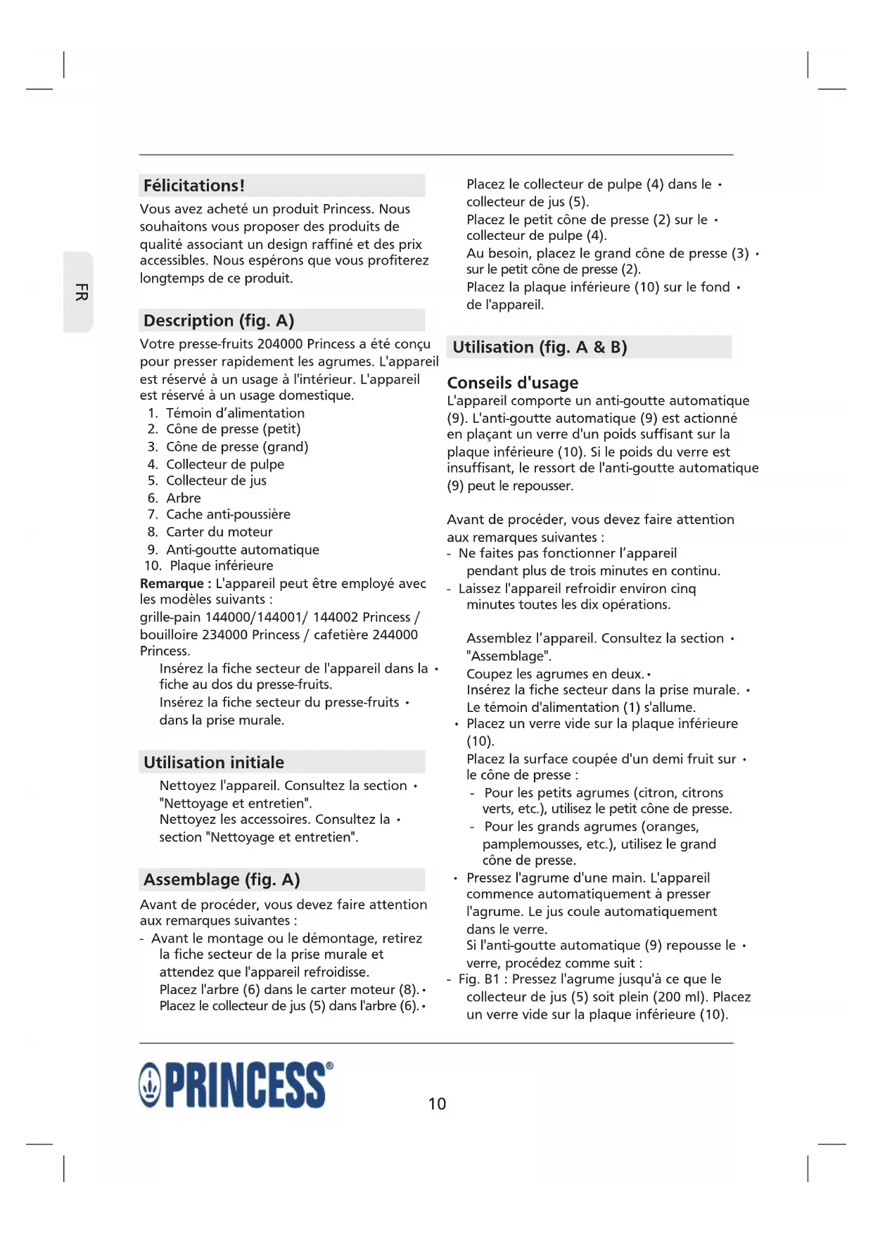 Félicitations! Vous avez acheté un produit Princess. Nous souhaitons vous proposer des produits de qualité associant un design raffiné et des prix accessibles. Nous espérons que vous profiterez longtemps de ce produit. Description (fig. A) Votre presse-fruits 204000 Princess a été conçu pour presser rapidement les agrumes. L'appareil est réservé à un usage à l'intérieur. L'appareil est réservé à un usage domestique.