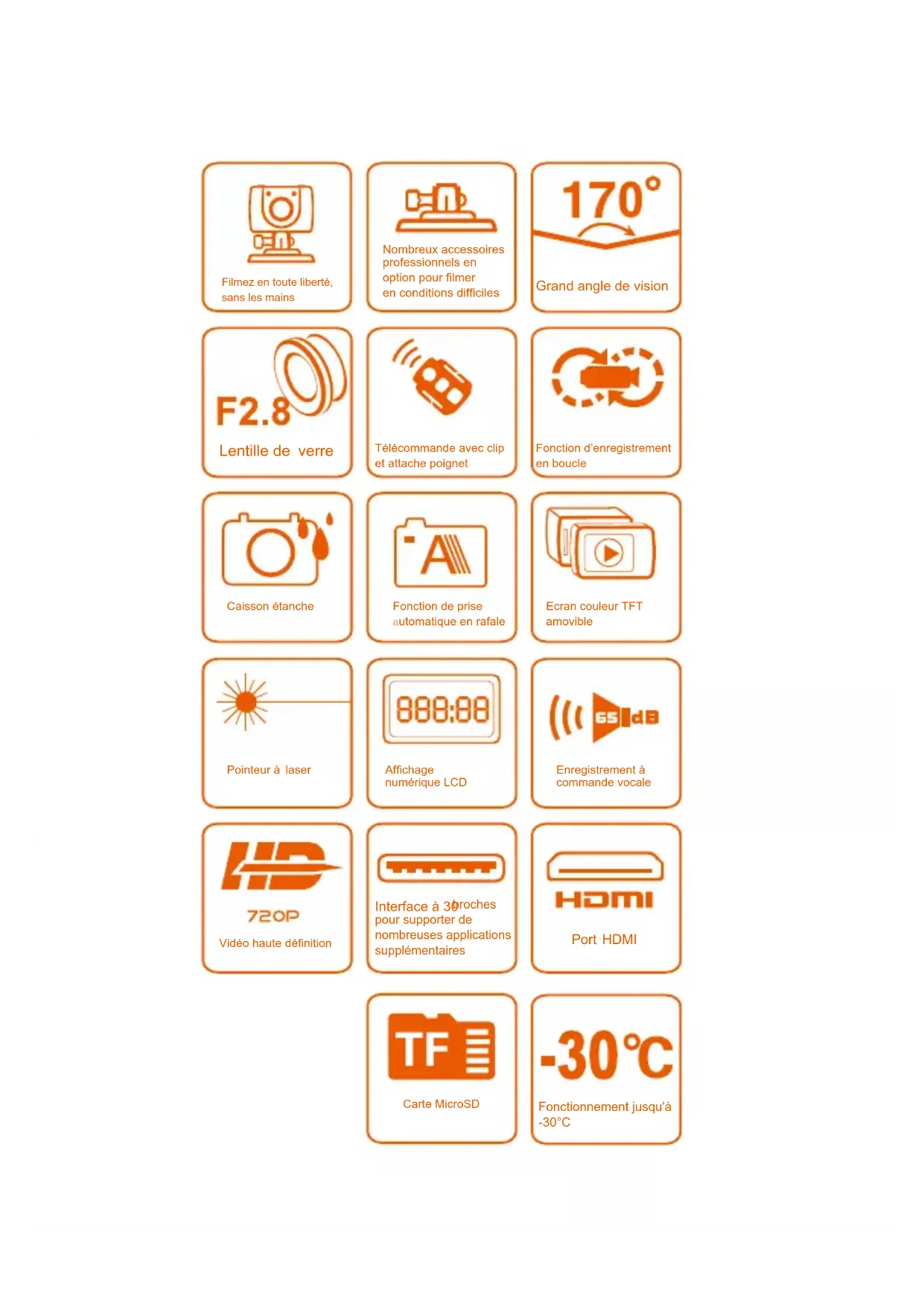 Filmez en toute liberté,sans les mains Télécommande avec clip et attache poignetFonction d’enregistrement en boucle Lentille de verre Caisson étancheAffichage numérique LCDEnregistrement à commande vocalePointeur à