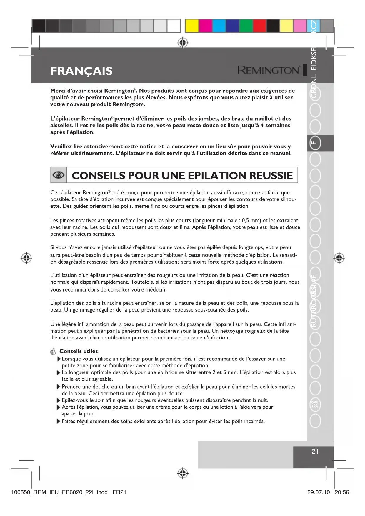 Faites régulièrement des soins exfoliants après l’épilation pour éviter les poils incarnés. FRANÇAIS 100550_REM_IFU_EP6020_22L.indd FR21100550_REM_IFU_EP6020_22L.indd FR21 29.07.10 20:5629.07.10 20:56FRANÇAIS