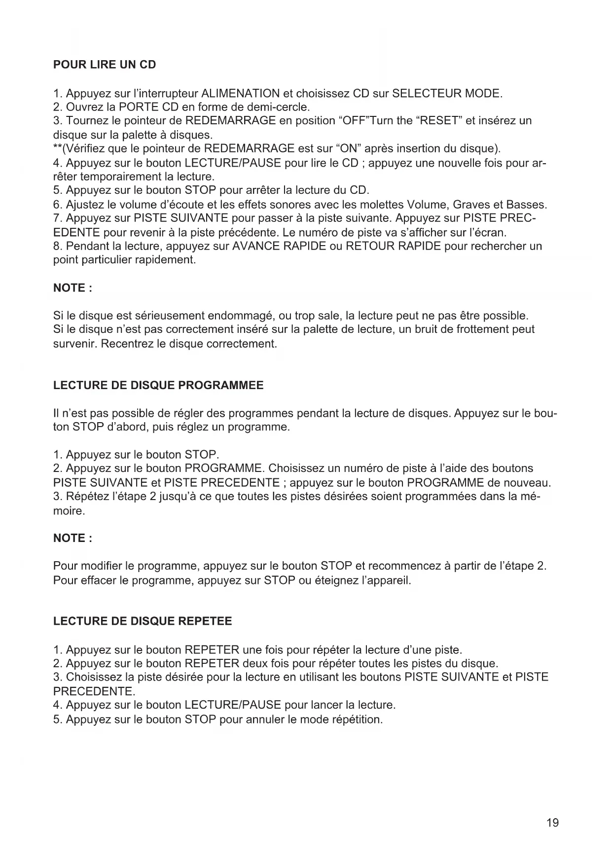 4. Appuyez sur le bouton LECTURE/PAUSE pour lire le CD ; appuyez une nouvelle fois pour ar-