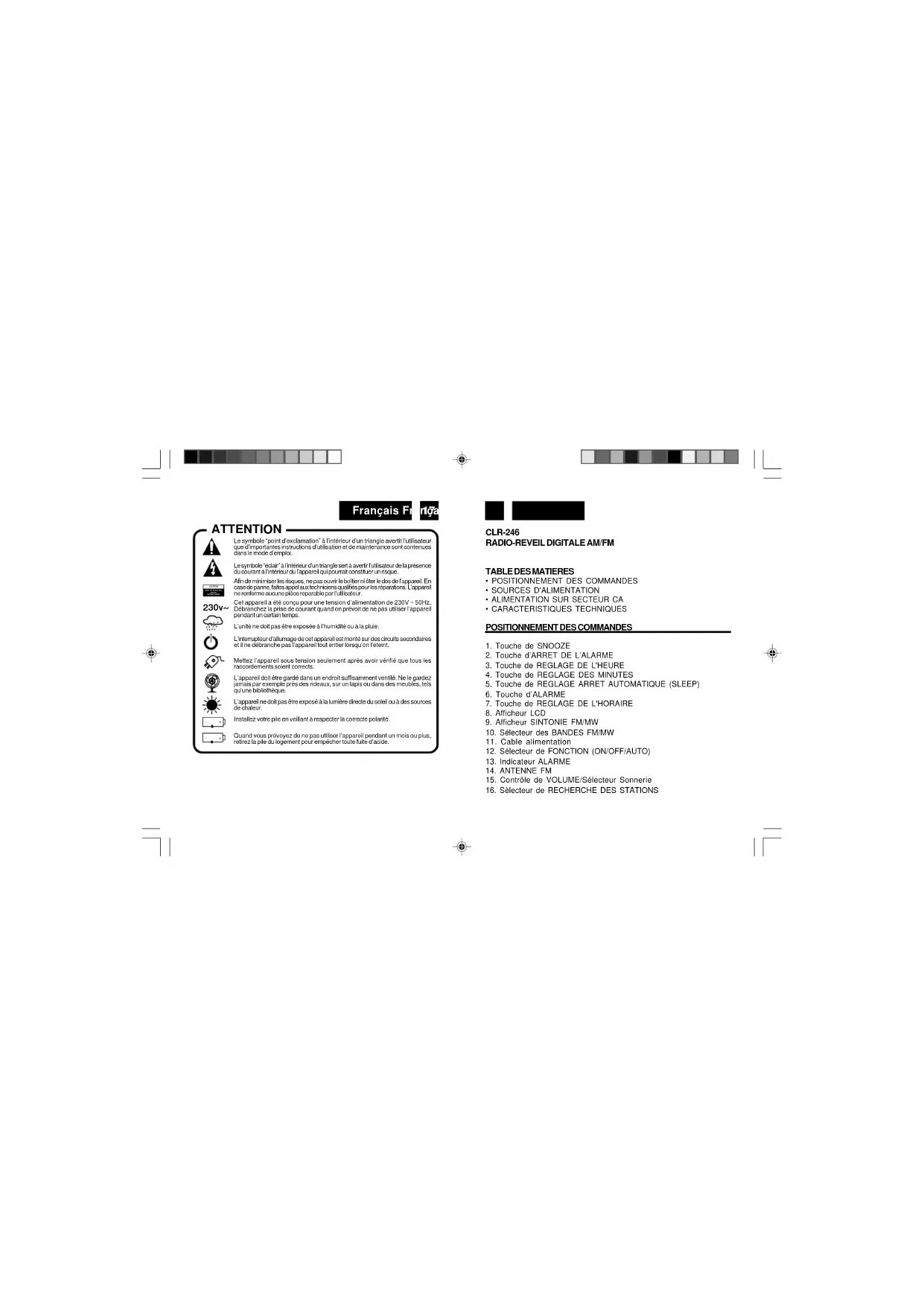 Pour évider tout risque de décharge électrique, n'exposer ce radioreveil ni à la plule, ni à l'humidité.