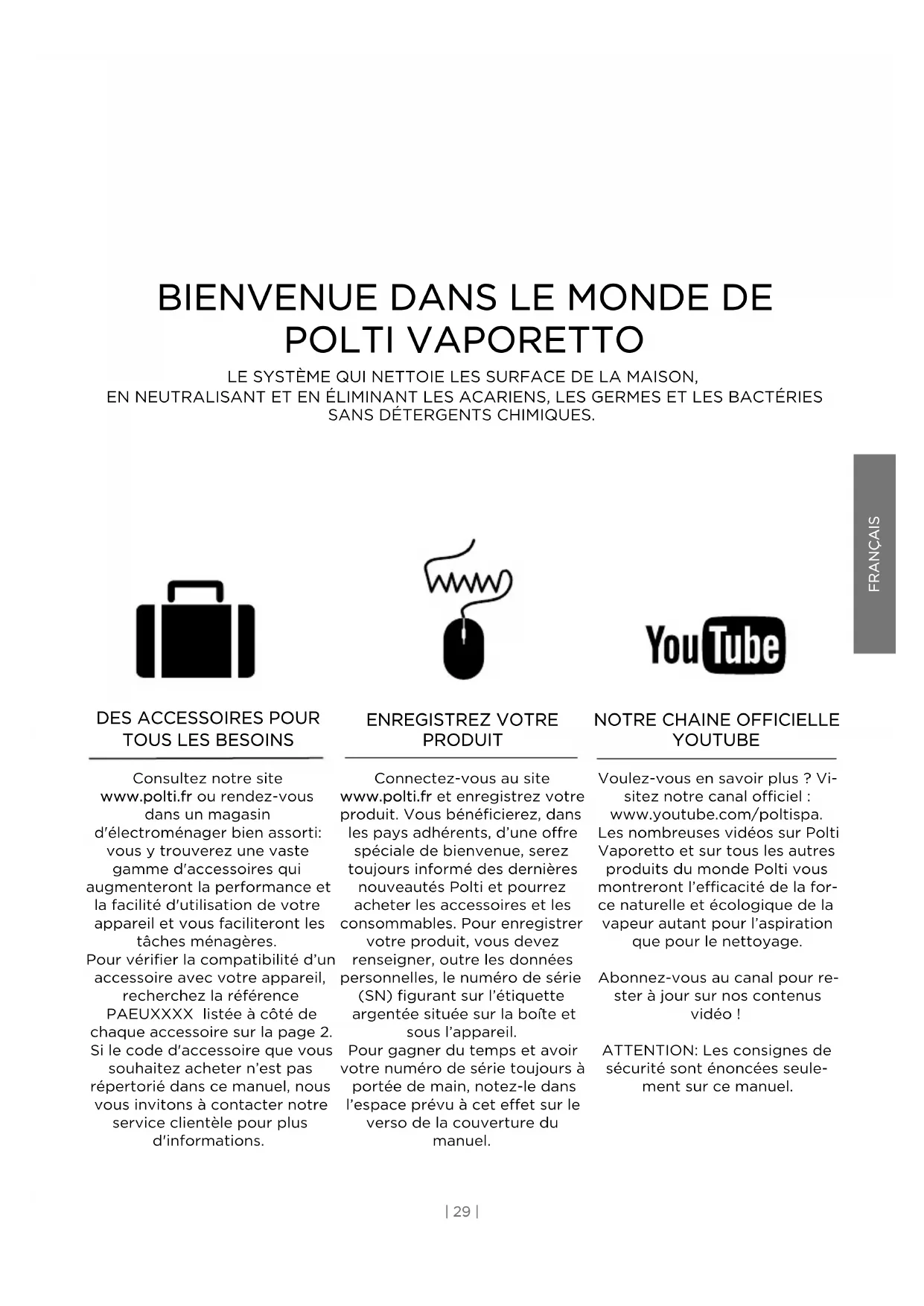 YOUTUBE Voulez-vous en savoir plus? Vi- sitez notre canal officiel: www.youtube.com/poltispa. Les nombreuses vidéos sur Polti Vaporetto et sur tous les autres produits du monde Polti vous montreront l’efficacité de la for- ce naturelle et écologique de la vapeur autant pour l’aspiration que pour le nettoyage. Abonnez-vous au canal pour re- ster à jour sur nos contenus vidéo! ATTENTION: Les consignes de sécurité sont énoncées seule- ment sur ce manuel.AVERTISSEMENTS EN MATIÈRE DE SÉCURITÉ