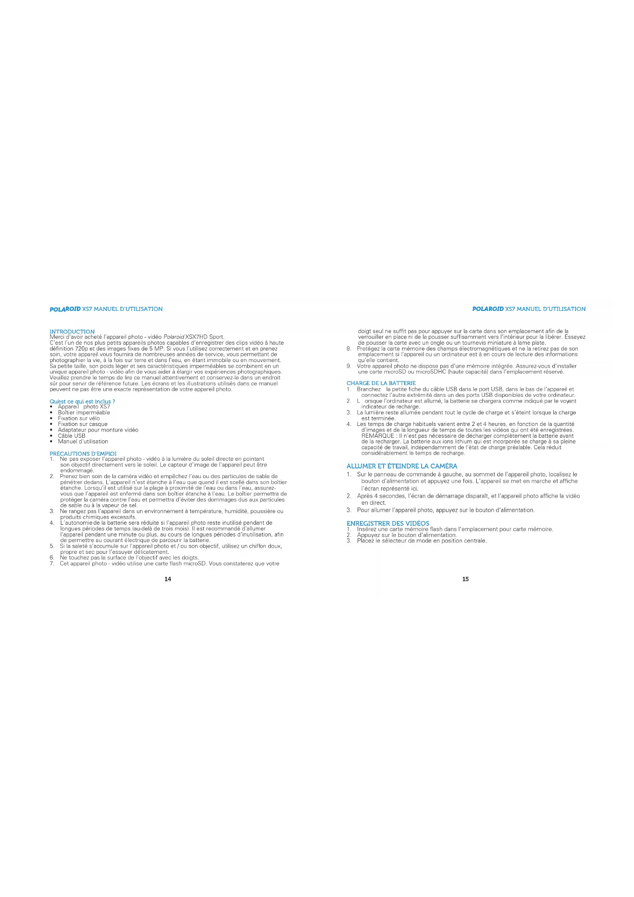 INTRODUCTION Mercid’avoirachetél’appareilphoto-vidéoPolaroidXSX7HDSport. C’estl’undenospluspetitsappareilsphotoscapablesd’enregistrerdesclipsvidéoàhaute définition720petdesimagesfixesde5MP.Sivousl’utilisezcorrectementetenprenez soin,votreappareilvousfourniradenombreusesannéesdeservice,vouspermettantde photographierlavie,àlafoissurterreetdansl’eau,enétantimmobileouenmouvement. Sapetitetaille,sonpoidslégeretsescaractéristiquesimperméablessecombinentenun uniqueappareilphoto-vidéoafindevousaideràélargirvosexpériencesphotographiques. Veuillezprendreletempsdelirecemanuelattentivementetconservez-ledansunendroit sûrpourservirderéférencefuture.Lesécransetlesillustrationsutilisésdanscemanuel peuventnepasêtreuneexactereprésentationdevotreappareilphoto. Qu’ est ce qui est inclus ?