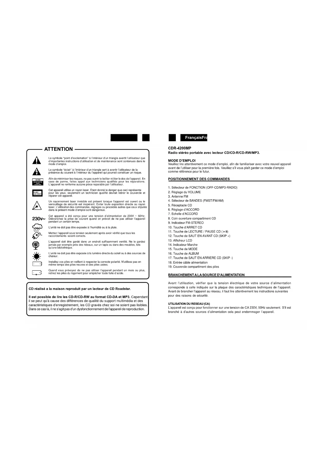 Avant l’utilisation, vérifier que la tension électrique de votre source d’alimentation corresponde à celle indiquée sur la plaque des caractéristiques techniques de l’appareil. Avant de brancher l’appareil au réseau, il faut lire attentivement les instructions suivantes pour des raisons de sécurité. UTILISATION DU RESEAU(CA) L’appareil est conçu pour fonctionner sur une tension de CA 230V, 50Hz seulement. S’il est branché à d’autres sources d’alimentation cela peut endommager l’appareil. ATTENTION Le symbole “point d’exclamation” à l’intérieur d’un triangle avertit l’utilisateur que d’importantes instructions d’utilisation et de maintenance sont contenues dans le mode d’emploi. Le symbole “éclair” à l’intérieur d’un triangle sert à avertir l’utilisateur de la présence du courant à l’intérieur du l’appareil qui pourrait constituer un risque. Afin de minimiser les risques, ne pas ouvrir le boîtier ni ôter le dos de l’appareil. En case de panne, faites appel aux techniciens qualifiés pour les réparations. L’appareil ne renferme aucune pièce reparable par l’utilisateur.Cet appareil utilise un rayon laser. Etant donné le danger que ceci représente pour les yeux, seulement un technicien qualifié devrait retirer le couvercle et réparer cet appareil. Un rayonnement laser invisible est présent lorsque l’appareil est ouvert ou le verrouillage de sécurité est inopérant. Eviter toute exposition directe au rayon laser. L’utilisation des commandes, réglages ou procédés autres que ceux stipulésdans le présent mode d’emploi sont dangereux. Cet appareil a été conçu pour une tension d’alimentation de 230V ~ 50Hz. Débranchez la prise de courant quand on prévoit de ne pas utiliser l’appareil pendant un certain temps. L’unité ne doit pas être exposée à l’humidité ou à la pluie. Mettez l’appareil sous tension seulement après avoir vérifié que tous lesraccordements soient corrects. L’appareil doit être gardé dans un endroit suffisamment ventilé. Ne le gardez jamais par exemple près des rideaux, sur un tapis ou dans des meubles, telsqu’une bibliothèque. L’unité ne doit pas être exposée à la lumière directe du soleil ou à des sources de chaleur.Installez vos piles en veillant à respecter la correcte polarité. N’utilisez pas enmême temps des piles neuves et des piles usées. Quand vous prévoyez de ne pas utiliser l’appareil pendant un mois ou plus, retirez les piles du logement pour empêcher toute fuite d’acide. CD réalisé a la maison reproduit par un lecteur de CD Roadstar. Il est possible de lire les CD-R/CD-RW au format CD-DA et MP3. Cependant, il se peut qu'à cause des différences de qualité du support multimédia et des caractéristiques d'enregistrement, les CD gravés chez soi ne soient pas lisibles. Dans ce caslà,ilnes'agitpas d'undysfonctionnementdel'appareildereproduction.FrançaisFrançais Pour la réception en MW les signaux sont interceptés par une antenne en ferrite incorporée. Pour que la réception soit la meilleure possible, il faut orienter l’appareil. Réception FM en Stéréophonie et Monophonie Quand un signal FM est intercepté, si l’on place le sélecteur de BANDES (4) sur la position FM ST il est possible d’écouter la station émettrice en stéréophonie. L’indicateur FM Stéréo (9) s’allume. Si la puissance des signaux stéréo est faible et la réception devient bruyante. il vaut souvent mieux de recevoir la station émettrice en monophonie. Placer le Sélecteur de Bandes (4) sur FM (Mono). La réception devrait être alors moins bruyante.