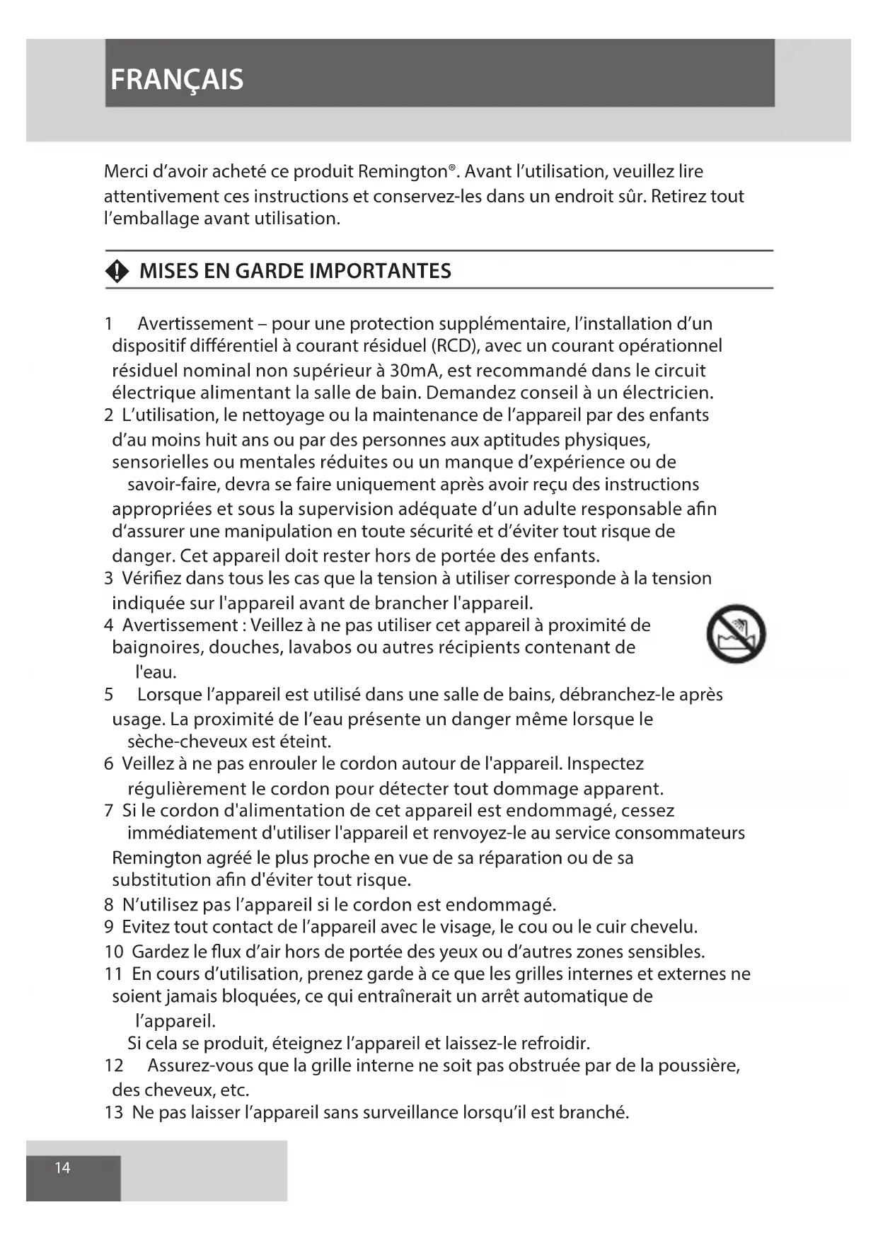 7 Si le cordon d'alimentation de cet apparéil est endommagé, cessez immédiatement d'utiliser l' apparéil et renvoyez-le au service consommateurs Remington agréé le plus proche en vue de sa réparation ou de sa substitution afin d'éviter tout risque.