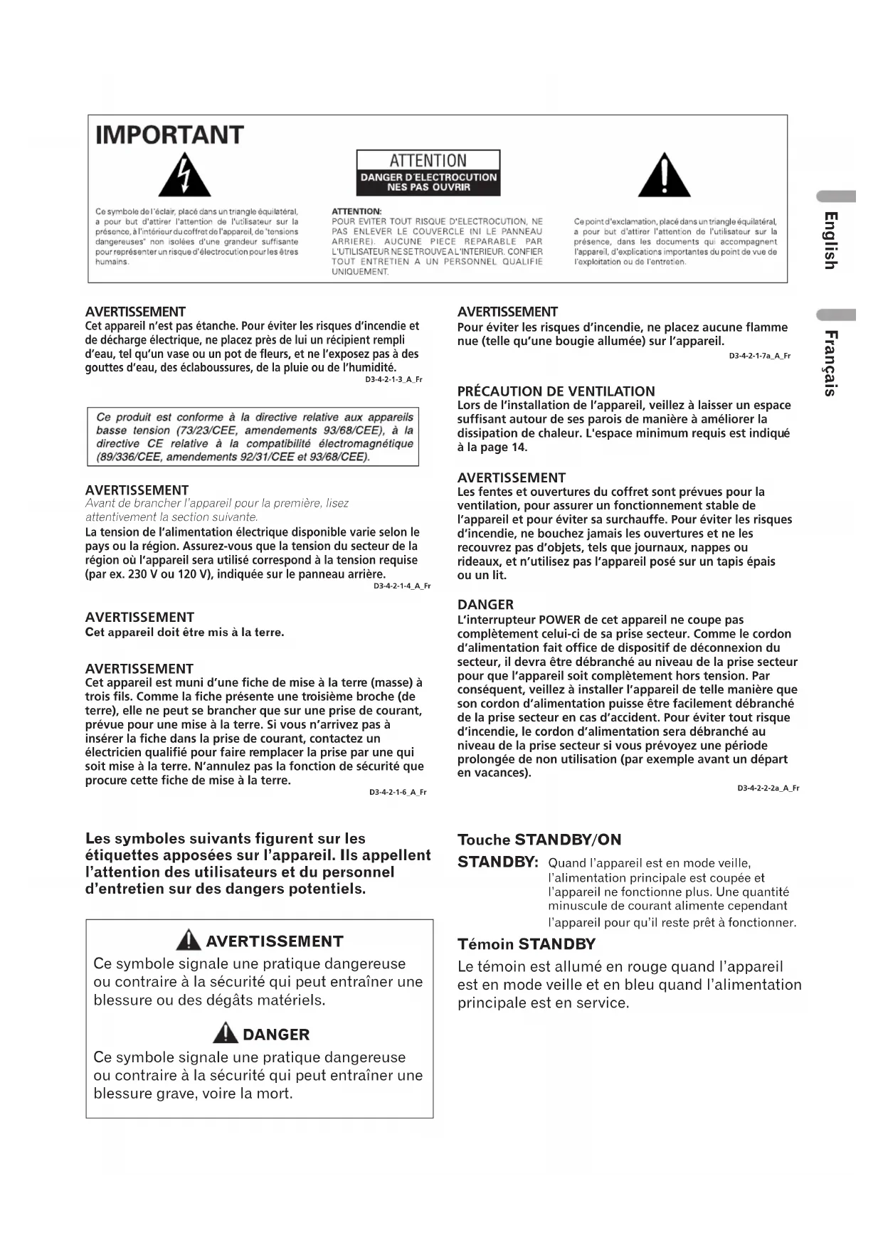 DANGER L’interrupteur POWER de cet appareil ne coupe pas complètement celui-ci de sa prise secteur. Comme le cordon d’alimentation fait office de dispositif de déconnexion du secteur, il devra être débranché au niveau de la prise secteur pour que l’appareil soit complètement hors tension. Par conséquent, veillez à installer l’appareil de telle manière que son cordon d’alimentation puisse être facilement débranché de la prise secteur en cas d’accident. Pour éviter tout risque d’incendie, le cordon d’alimentation sera débranché au niveau de la prise secteur si vous prévoyez une période prolongée de non utilisation (par exemple avant un départ en vacances). D3-4-2-2-2a_A_Fr