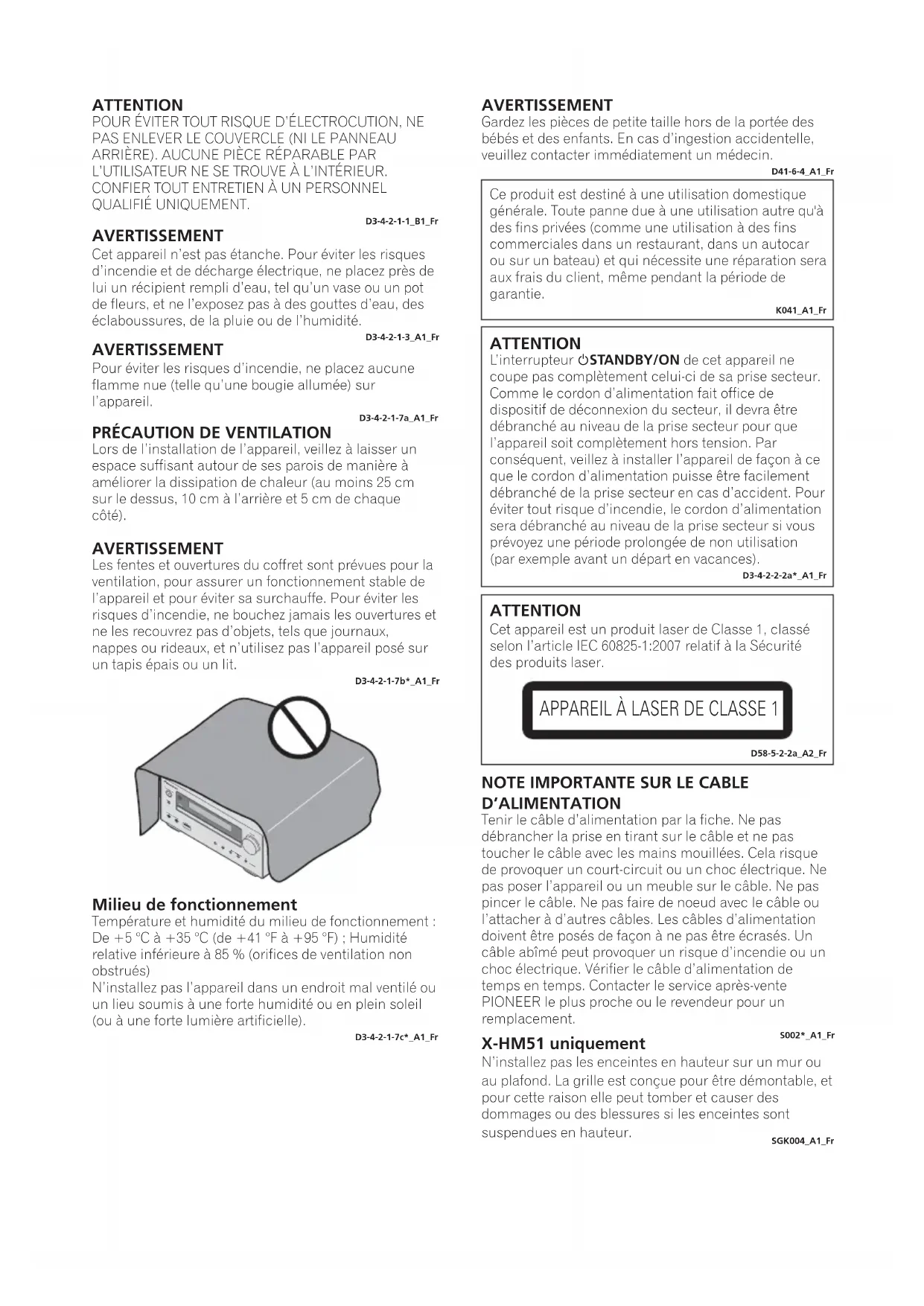 • Enceintes (X-HM51 uniquement) Enceintes protégées contre les interférences électromagnétiques Type Enceinte à 2 voiesDôme-Tweeter de 2,5 cmHaut-parleur de basse à cône de 12 cmPuissance d’entrée max. . . . . . . . . . . . . . . . . . . . . . . . . . . 50 W Impédance . . . . . . . . . . . . . . . . . . . . . . . . . . . . . . . . . . . . . . 4 : Dimensions externes . . . . . . . . . . . . . . . . .156 mm (L) x 241,5 mm (H) x 243 mm (P)Poids . . . . . . . . . . . . . . . . . . . . . . . . . . . . . . . . 3,4 kg (chacune) • Accessoires Télécommande. . . . . . . . . . . . . . . . . . . . . . . . . . . . . . . . . . . . . 1 Câble d’antenne AM . . . . . . . . . . . . . . . . . . . . . . . . . . . . . . . . 1 Antenne FM à fil . . . . . . . . . . . . . . . . . . . . . . . . . . . . . . . . . . . . 1Piles AAA (R03) . . . . . . . . . . . . . . . . . . . . . . . . . . . . . . . . . . . . 2Câbles d’enceinte (X-HM51 uniquement) . . . . . . . . . . . . . . . 2Support pour iPad . . . . . . . . . . . . . . . . . . . . . . . . . . . . . . . . . . 1Cordon d’alimentationCarte de garantieMode d’emploi (ce document) Remarque• Les spécifications sont valables pour une alimentation de 230 V.• Les spécifications et la conception sont susceptibles d’être modifiées sans préavis, en raison d’améliorations apportées à l’appareil.© 2013 PIONEER CORPORATION.Tous droits de reproduction et de traduction réservés.