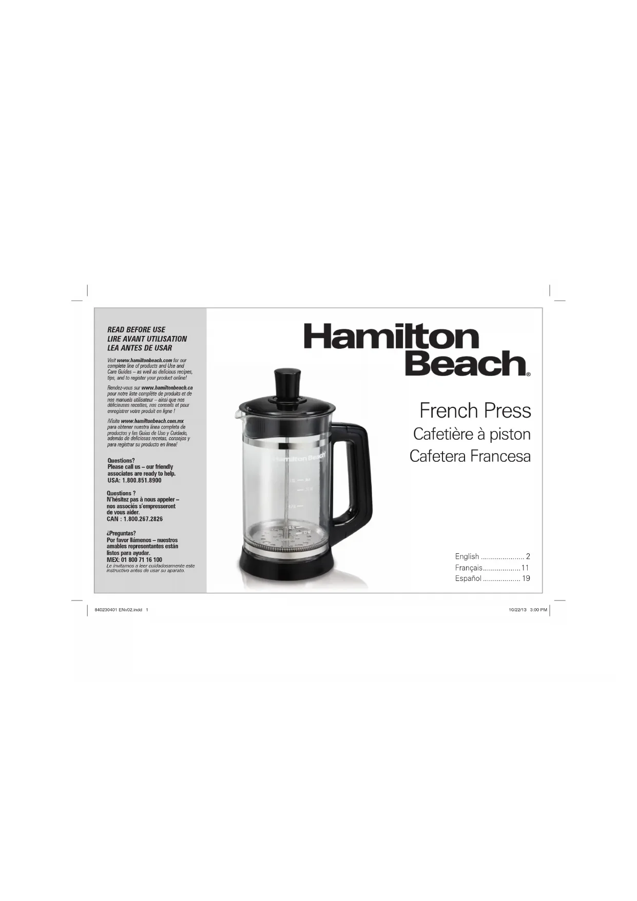 É.-U. ou au 1.800.267.2826 au Canada ou visiter le site internet www.hamiltonbeach.com aux É.-U. ou www.hamiltonbeach.ca