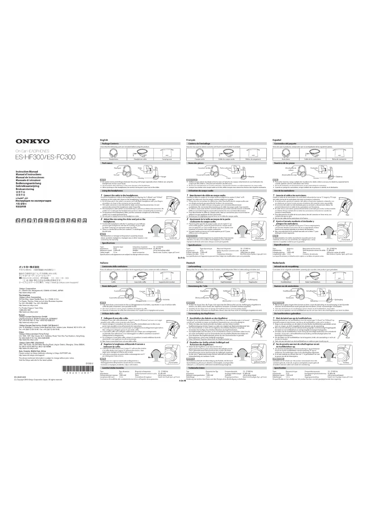 (C) Copyright 2013 Onkyo Corporation Japan. All rights reserved.D1302-2 * 2 9 4 0 1 4 9 3 * y Ne tirez pas trop fortement sur la partie coulissante. Cela pourrait entraîner un endommagement du casque audio.