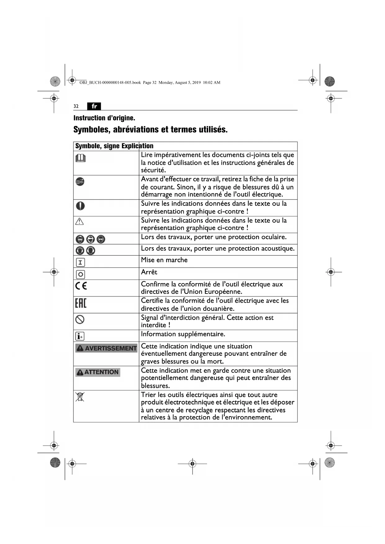 Instruction d’origine. Symboles, abréviations et termes utilisés. Symbole, signe Explication Lire impérativement les documents ci-joints tels que la notice d’utilisation et les instructions générales de sécurité. Avant d’effectuer ce travail, retirez la fiche de la prise de courant. Sinon, il y a risque de blessures dû à un démarrage non intentionné de l’outil électrique. Suivre les indications données dans le texte ou la représentation graphique ci-contre ! Suivre les indications données dans le texte ou la représentation graphique ci-contre ! Lors des travaux, porter une protection oculaire. Lors des travaux, porter une protection acoustique. Mise en marche Arrêt Confirme la conformité de l’outil électrique aux directives de l’Union Européenne. Certifie la conformité de l’outil électrique avec les directives de l’union douanière. Signal d’interdiction général. Cette action est interdite ! Information supplémentaire. Cette indication indique une situation éventuellement dangereuse pouvant entraîner de graves blessures ou la mort. Cette indication met en garde contre une situation potentiellement dangereuse qui peut entraîner des blessures. Trier les outils électriques ainsi que tout autre produit électrotechnique et électrique et les déposer à un centre de recyclage respectant les directives relatives à la protection de l’environnement. AVERTISSEMENT ATTENTION OBJ_BUCH-0000000148-005.book Page 32 Monday, August 5, 2019 10:02 AM33