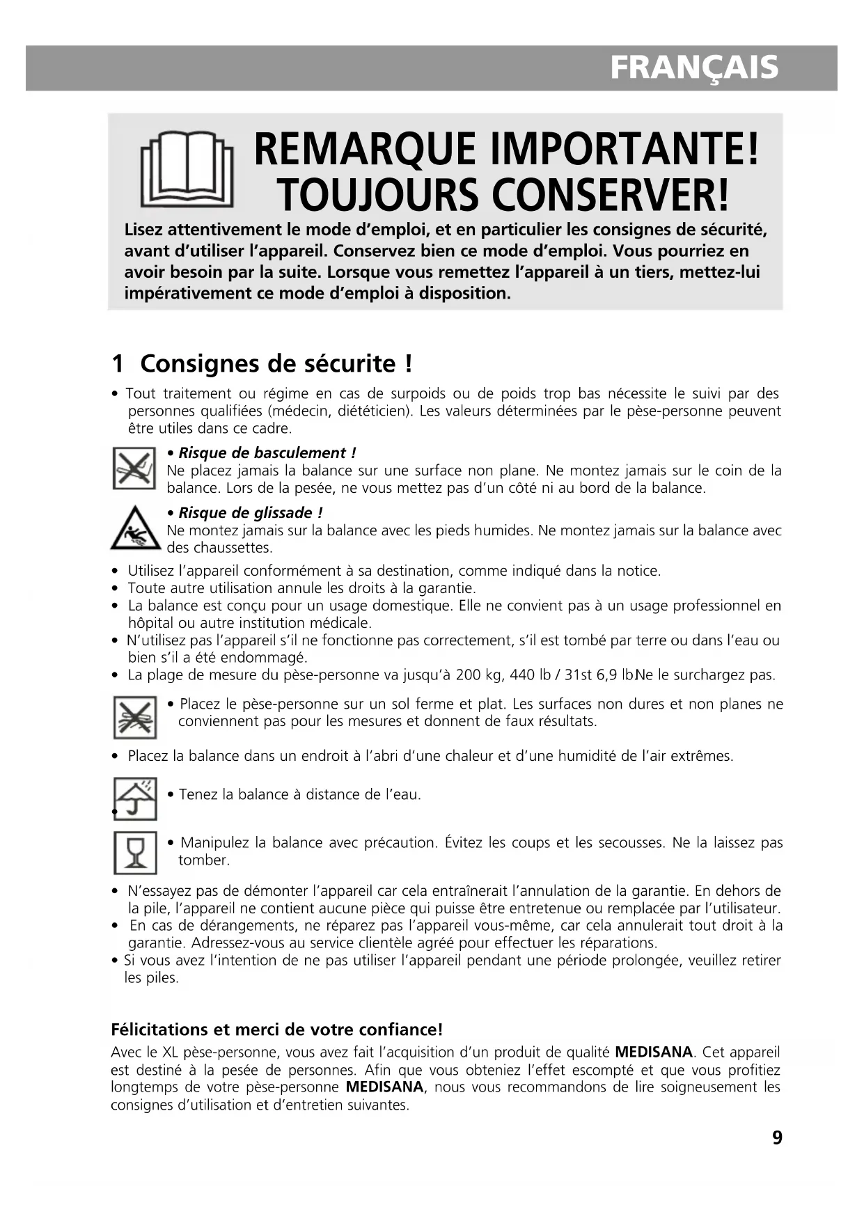 - Manipulez la balance avec précaution. Évitez les coups et les secousses. Ne la laissez pastomber.• N’essayez pas de démonter l’appareil car cela entraînerait l’annulation de la garantie. En dehors dela pile, l’appareil ne contient aucune pièce qui puisse être entretenue ou remplacée par l’utilisateur.• En cas de dérangements, ne réparez pas l’appareil vous-même, car cela annulerait tout droit à lagarantie. Adressez-vous au service clientèle agréé pour effectuer les réparations.• Si vous avez l’intention de ne pas utiliser l’appareil pendant une période prolongée, veuillez retirerles piles. Félicitations et merci de votre confiance! Avec le XL pèse-personne, vous avez fait l’acquisition d’un produit de qualité MEDISANA. Cet appareil est destiné à la pesée de personnes. Afin que vous obteniez l’effet escompté et que vous profitiezlongtemps de votre pèse-personne MEDISANA, nous vous recommandons de lire soigneusement lesconsignes d’utilisation et d’entretien suivantes.40433_XL_Personenwaage_PS_460_29.07.qxd:Kompakt-GA 29.07.2013 21:23 Uhr Seite 910 FRANÇAIS 2 Éléments fournis et emballage Veuillez vérifier si l'appareil est au complet et ne présente aucun dommage. En cas de doute, ne faites pas fonctionner l’appareil et adressez-vous à votre revendeur ou à un point de service après-vente. La fourniture comprend: