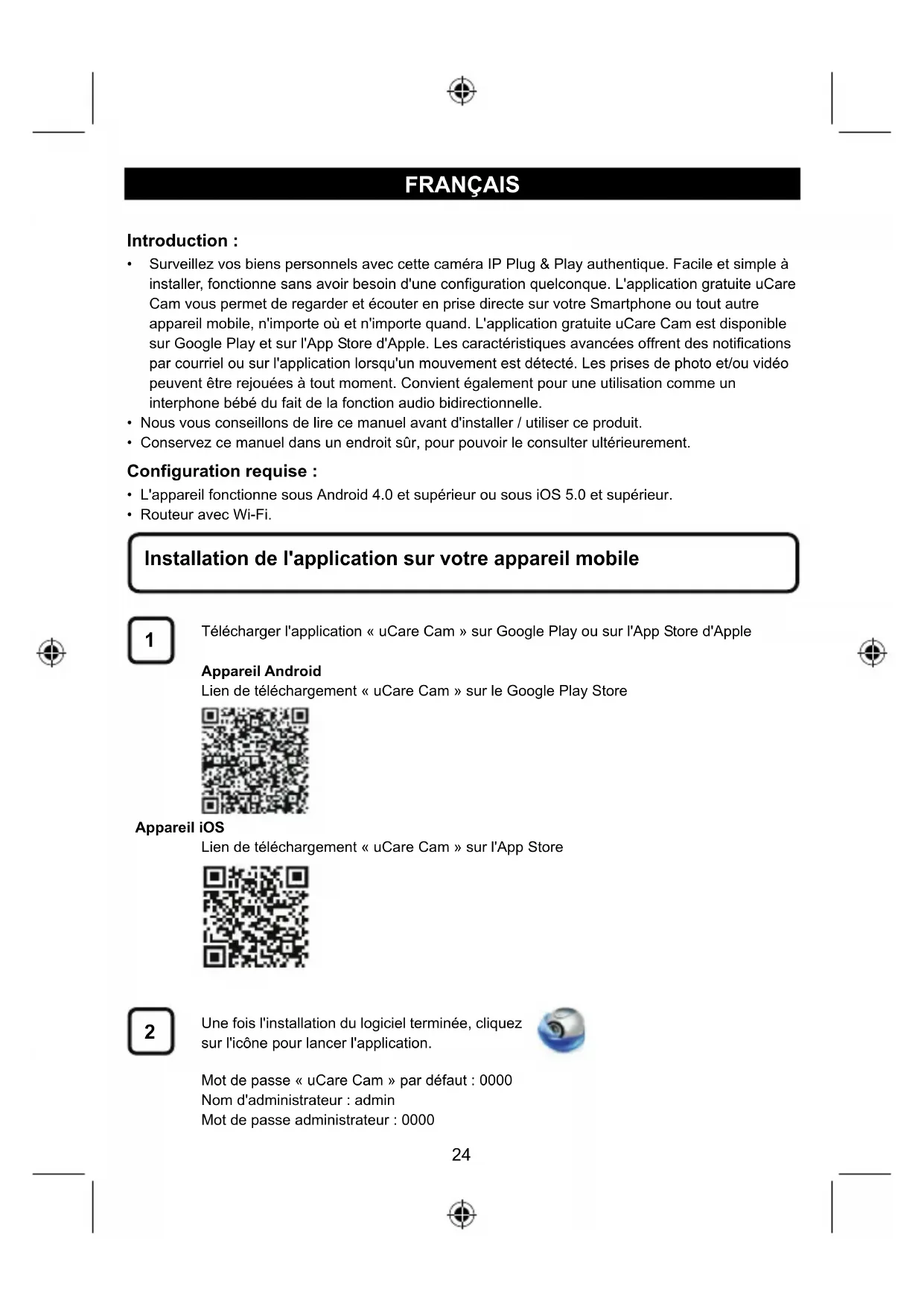 Télécharger l'application « uCare Cam » sur Google Play ou sur l'App Store d'Apple